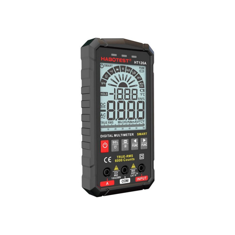 HT126A on nutikas ja vastupidav multimeeter Habotestilt. Selle täpsed mõõtmised võimaldavad seda kasutada ka välitingimustes. Varustatud suure ekraani ja silikoonnuppudega - see on lihtne ja mugav kasutada. Kompaktne ja kerge - sellel on ka LED-taskulamp, mis võimaldab töötada isegi pimedates kohtades. Selle toiteks on vaja 4 AAA 1,5 V patareid. Need ei ole aga komplektis ja tuleb eraldi osta. Saate seda kasutada pinget, takistust, mahtuvust jne mõõtmiseks.