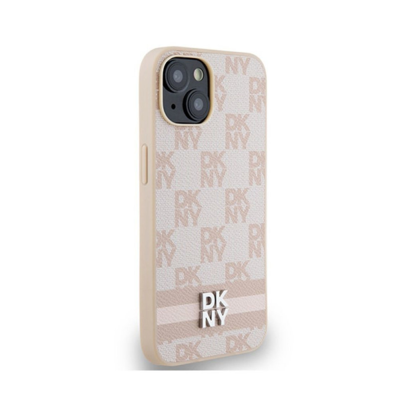 DKNY Leather Checkered Mono Pattern & Printed Stripes - Etui iPhone 14 / 15 / 13 (różowy)