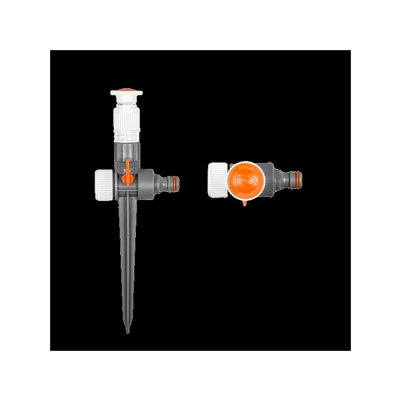 Ороситель садовый статический создает водяной "зонтик". Угол распыления регулируется от струи до полного круга. Ороситель у основания имеет краник. Устанавливается на пластиковом колышке. Подключение к шлангу стандартное, через соединительный коннектор установленный на шланг. Также имеет закрытую крышкой наружную резьбу ½" которая позволяет производить последовательное подключение с другими оросителями.