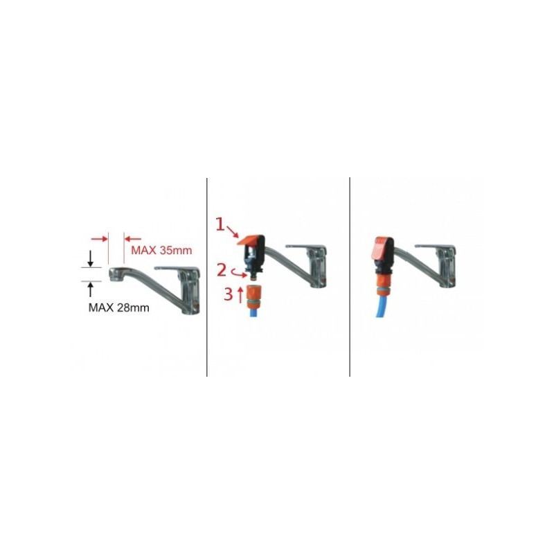 Universaalne kraanadapter ilma keermeta. Sobib ühendamiseks tavalise veekraaniga.