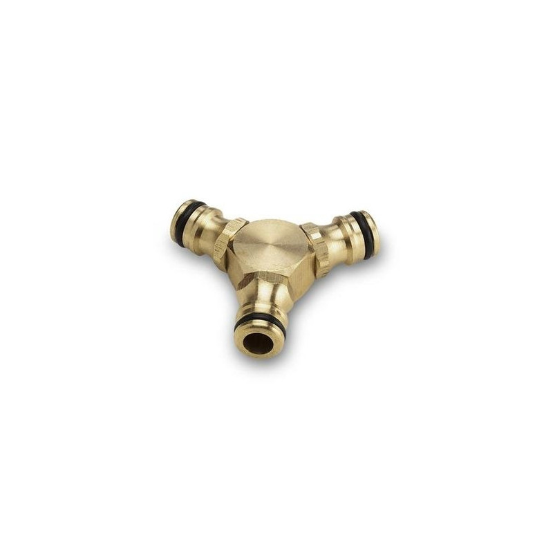 High-quality, tough three-way brass connector for connecting three hoses. For connecting two separate hoses. The new range of high-quality brass connectors from Kärcher for semi-professional use in the garden for all pressures. This high-quality, tough connector is extremely durable and suitable for heavy-duty use. Watering with Kärcher is the smart way to water!<br><br>- For watering small to large areas and gardens.<br>- For watering large gardens.<br>- For watering food plants and useful plants (small beds, individual and potted plants).<br>- For watering ornamental plants (small beds, individual and potted plants).<br>- Cleaning gardening tools and garden furniture.Kärcher 2.645-101.0. Quantity per pack: 1 pc(s)