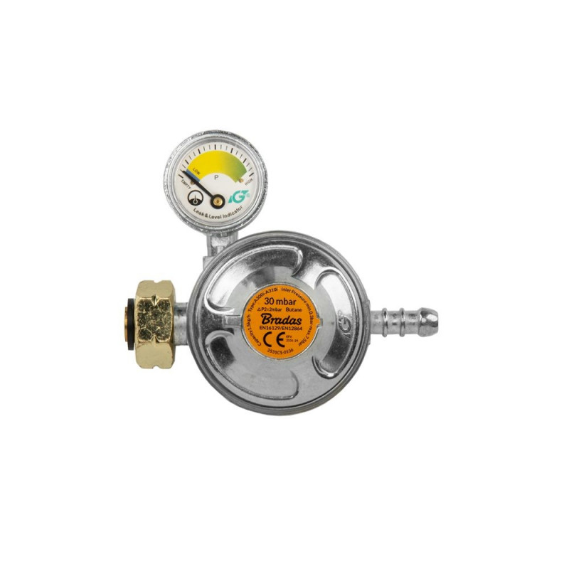 Propaanbutaani gaasiregulaator 30 mbar, 1,5kg/h koos avariiventiili ja manomeetriga, 9-10mm jaoks