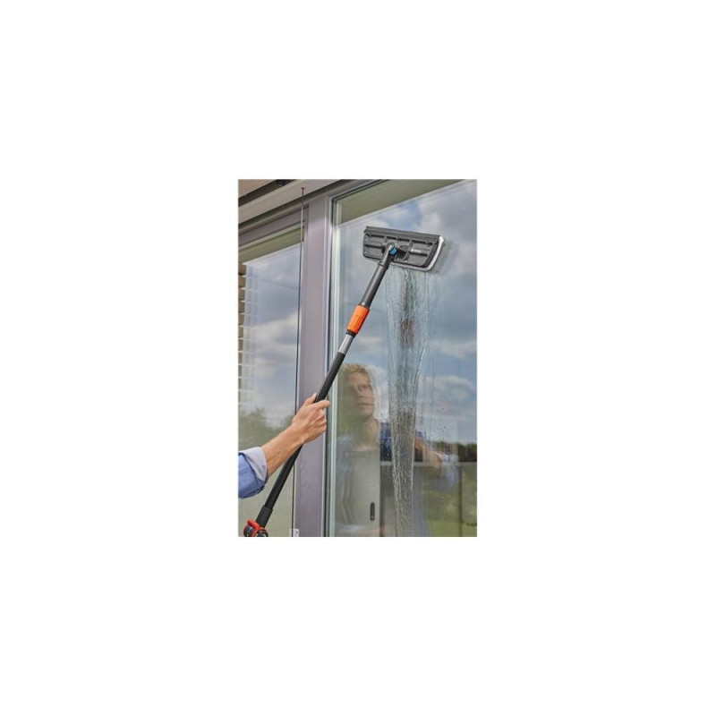 The GARDENA Window Cleaner cleans outdoor glass surfaces effectively and streak-free.<br><br><b>Cleaning glass surfaces outside</b><br>Exterior windows, in particular, are exposed to a lot of dirt from roads and weather, for example. The window wiper with squeegee has been specially developed to restore glass panes to their former glory quickly and as conveniently as possible. For smaller areas, the window cleaner can simply be connected directly to the garden hose as a hand tool using the original GARDENA system connection, while for larger areas, it can be used in combination with a running-water GARDENA Cleansystem Handle.<br><br><b>A handy and flexible windscreen cleaner</b><br>With a width of 31 cm and full 360° rotation, the cleaning squeegee is easy and effortless to use and can even reach hard-to-reach places thanks to its flexibility. The swivel joint can be easily locked so that the scrubber can be used without any problems.<br><br><b>2-in-1: Window cleaner and squeegee for streak-free windows</b><br>This practical window washer combines two effective functions for spotless windows. The removable microfibre fleece carefully removes dirt, while the hard-wearing rubber blade removes water and soap from the glass surfaces without leaving streaks. This leaves the end result completely free of annoying smudges or fluff.<br><br><b>The GARDENA Cleansystem Handles for optimum reach</b><br>Sometimes, you need a helping hand, especially when cleaning larger surfaces and higher areas. So that you don’t have to rely on a wobbly ladder, the GARDENA running-water handles offer a convenient and safe extension. They can be used to effortlessly clean high windows, patio roofs, greenhouses or conservatories. The water volume can be conveniently adjusted on the handle. For heavy soiling, you can also use GARDENA Shampoo (Art. 1680) to further increase the efficiency of the handled brush. Gardena 18808-20. Length: 310 mm, Height: 310 mm, Weight: 315 g. Quantity per pack: 1 pc(s)