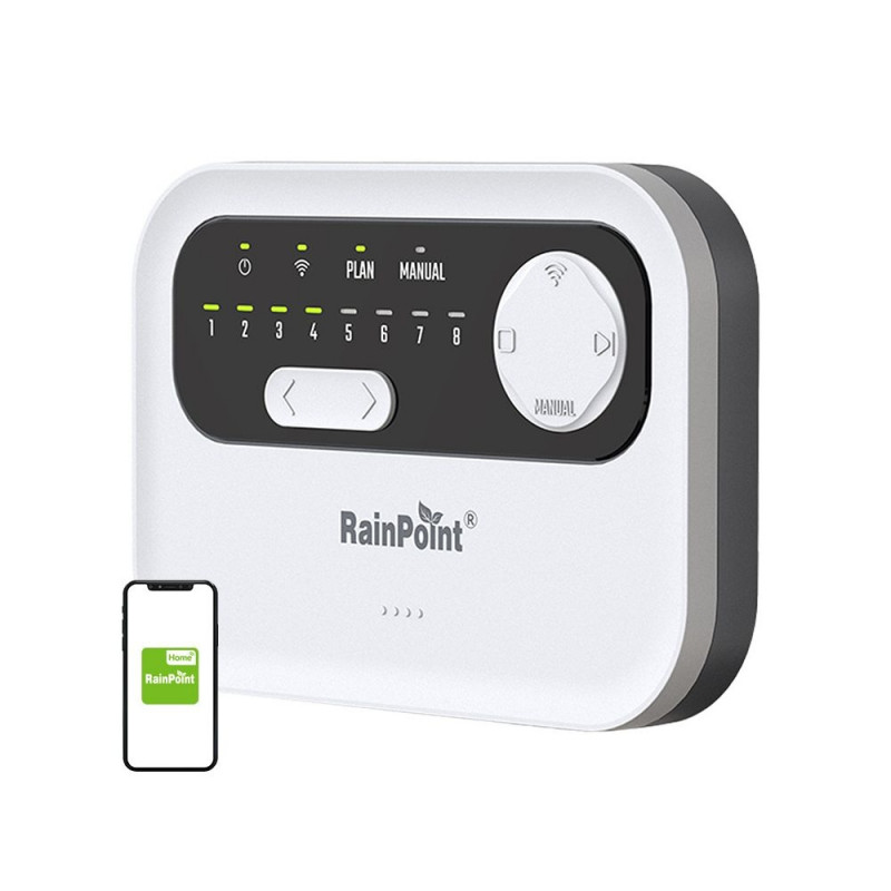 RainPointi kastmiskontroller on terviklik lahendus kaug- ja nutikaks kastmiseks. Tänu otsesele Wi-Fi ühendusele ja RainPoint Home rakendusele saad täieliku kontrolli kaheksa tsooni ja põhiklapi üle, võimalusega programmeerida kuni kaheksa eraldi kastmisgraafikut, hoolduskalendrit ja vihmapausi ning kasutada automaatset kastmistsüklite vahelejätmist tänu välistele pinnase niiskuse- ja vihmaanduritele. Seadmel on testnupud kiireks ühenduse kontrolliks, alarmid klappide lahtiühendamise korral, multifunktsionaalne toitegränesliides ning nutikas kastmise algusaegade kohandamine vastavalt klappide järjestusele. Panusta täpsusele, tõhususele ja meelerahule – vali RainPoint juba täna!