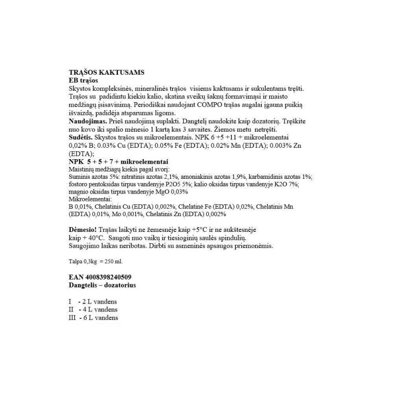 Tehnilised andmed:- Toote nimetus: COMPO Kaktuste Vedelväetis