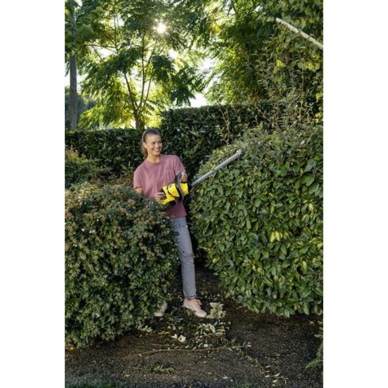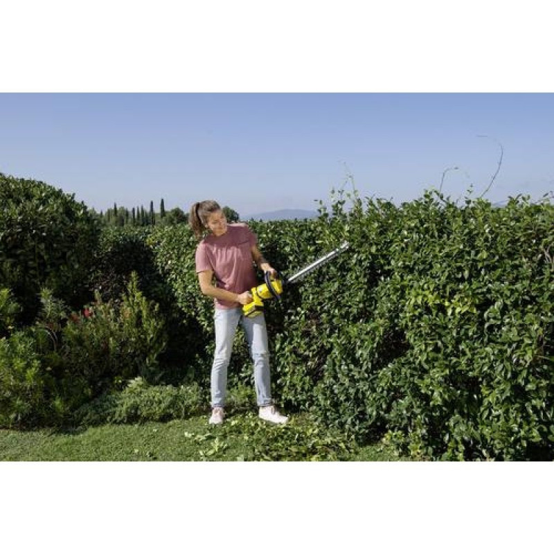 <b>HGE 18-50 BATTERY SET</b><br><br>No more tired shoulders and arms when working: Thanks to the 180° rotating handle, the battery-powered hedge trimmer HGE 18-50 Battery Set provides a comfortable working position at all times, for example when making vertical cuts. In addition, the battery hedge trimmer features a number of practical functions. The two-hand safety circuit prevents the device from being started unintentionally. The saw function makes cutting thicker branches a breeze. And the cuttings sweeper attachment transports the hedge cuttings, which would otherwise land in the hedge, directly along the ground. The blade on the battery hedge trimmer is diamond-ground and therefore leaves behind precise cutting results. The additional blade protector with integrated lifting eye protects buildings, floors and the blade itself from damage – and enables the device to be hung up on the wall to save space. One battery and a fast charger are included in the scope of supply.<br><br><b>Rotatable rear handle</b><br><br>The handle can be rotated by 180° in multiple increments to provide a comfortable working position.<br><br><b>Hedge broom</b><br><br>Conveniently sweeps the hedge cuttings which would normally fall into the hedge along the ground in front of the user.<br><br><b>Saw function</b><br><br>Particularly practical for hedges with occasional thicker branches.Kärcher HGE 18-50 BATTERY SET. Power source: Battery, AC input voltage: 100-240 V, AC input frequency: 50 - 60 Hz. Weight: 2.9 kg, Width: 213 mm, Depth: 970 mm