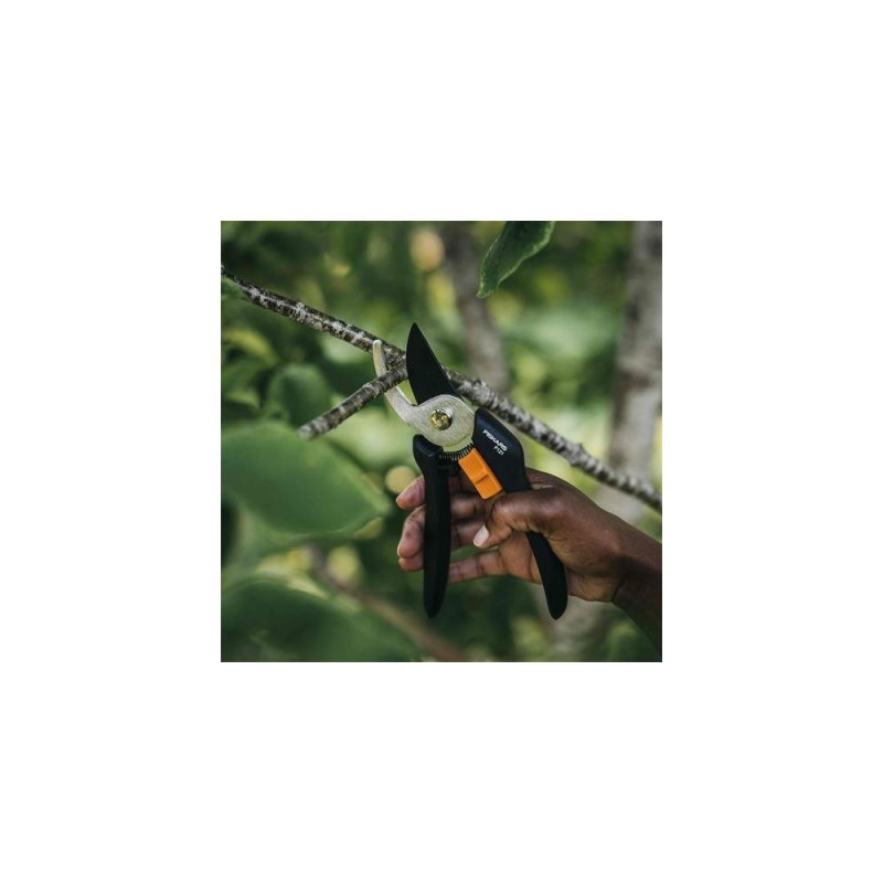 This lightweight, easy-to-use pruner is ideal for trimming stems and thin branches. A fully hardened, precision-ground blade stays sharp longer, while a low-friction blade coating resists rust and allows for smoother, easier cuts. Equipped with a light, yet sturdy, FiberComp™ handle, this pruner also has an easy-open lock that protects the blade during transport and storage.Fiskars Solid P121. Cutting system: Bypass, Handle material: Plastic, Handle colour: Black. Length: 192 mm, Cutting capacity: 1.8 cm, Weight: 100 g. Quantity per pack: 1 pc(s)