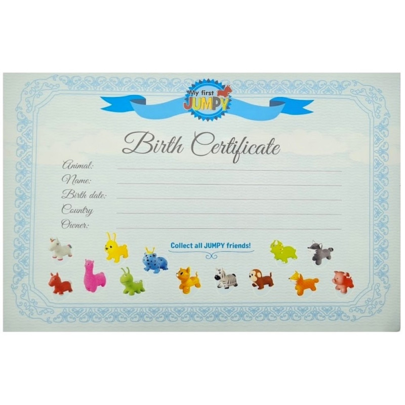 Hüppeloomaga kaasas on ka tema sünnitunnistus. Sinna saab laps oma loomakesele nime panna ning tema sünnipäeva määrata, et ka Jumpyl oleks oma tähtis päev, mida koos tähistada.