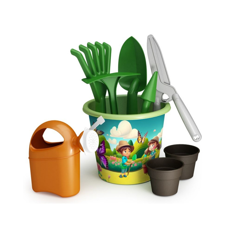 Ämber koos aiatarvikutega: käärid, kühvel, reha, kastekann, istutusabi, kirka ja 2 potti.