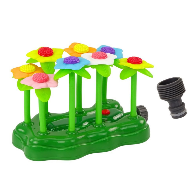 Mänguasjal on roheline alus, mis on stabiilne ja vastupidav, tagades ohutu mängimise. Alusel on kaheksa värvilist kummist lille, mis näevad atraktiivsed välja ja kutsuvad lapsi mängima. Aluse küljel on ava, kuhu saab ühendada aiavooliku.