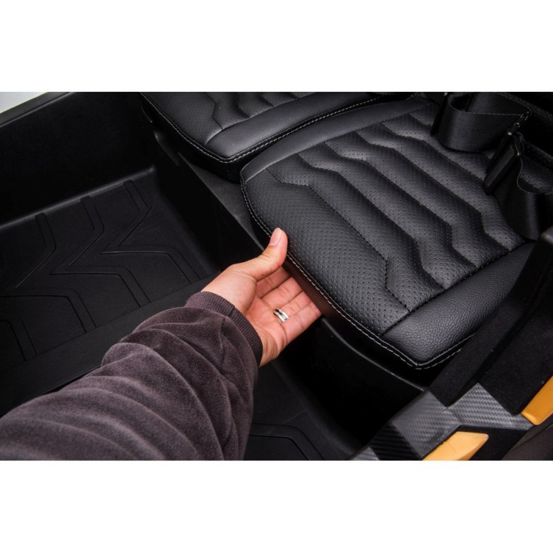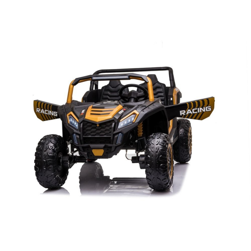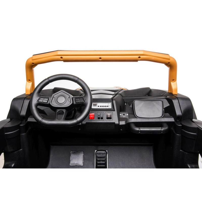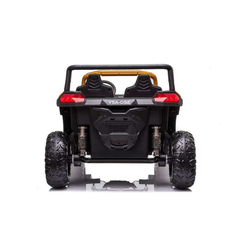 Akutoitega sõiduk Mudel: A032 Värv: Kuldne Tehnilised andmed Vedav mootor: 2x200W Aku: 24V7Ah Käigukast: Automaatne, 3 kiirust Sõiduki mõõdud: 135 cm x 95 cm x 80 cm Kiirus: 6–9 km/h Tühimass: 31 kg Maks. kandevõime: 60 kg Laadimisaeg: 8 tundi Tööaeg: 1–2 tundi Pidur: Automaatne, aktiveerub gaasipedaali vabastamisel Varustus Turvavööd: + Avatavad uksed: + Võtmed: X Istmepadjad: Ökonahk Rattad: Pehmed EVA Pult: 2.4G Tuled: Ees- ja tagumised LED-tuled Audio: USB Kauba pikkus sentimeetrites: 85 Kauba kõrgus sentimeetrites: 135 Kauba laius sentimeetrites: 50 Mahukaal grammides: 95625Toote koodid
