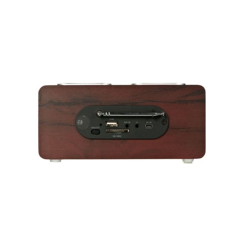 SD/USB-mängija MP3-muusikafailide jaoks (kuni 32 GB) FM-raadio 60 jaama mäluga AUX-sisend Kõrvaklappide väljund Teleskoopraadioantenn Punane LED ekraan Väljundvõimsus: 2 x 3 W RMS Aku töö: sisseehitatud laetav aku BL-5C 3,7 V 600 mAh Toide: 5 V 1 A (microUSB) Aku tööaeg: 3-4 h Laadimisaeg: 4-6 h Pult Mõõdud: 180 (L) x 80 (K) x 100 (P) mm Kaal: 0,72 kg