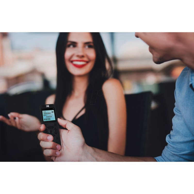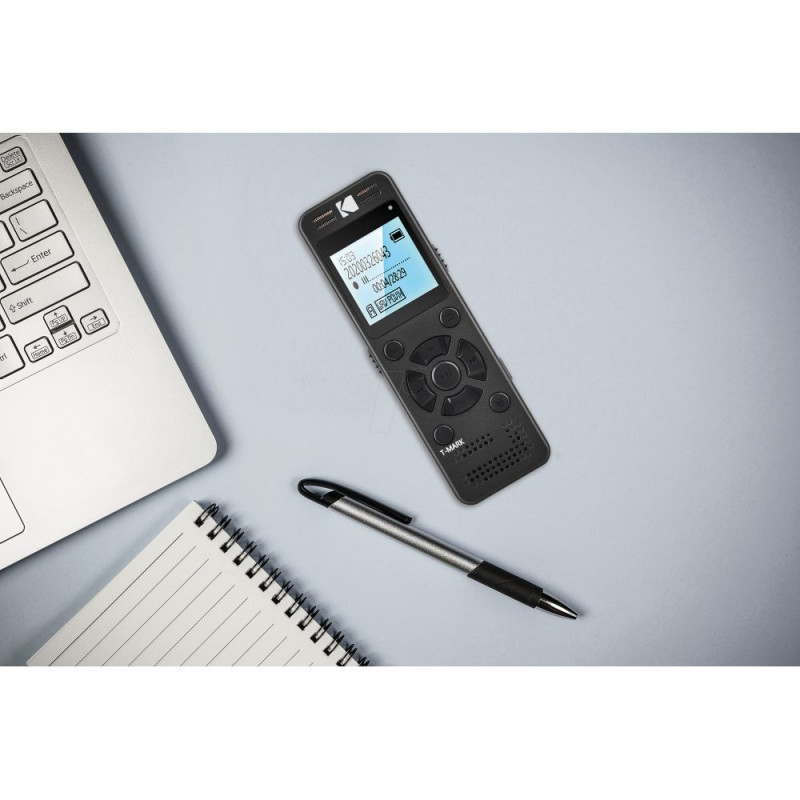 KODAK VRC 350 digitaalne diktofonTehnilised andmed Salvestustüüp: Mono Sisseehitatud mikrofon: üks mitmesuunaline kanal Sisemälu maht: 8 GB Mälukaardi pesa: PUUDUB Salvestusvormingud: MP3 / WAV Toetatud helivormingud: MP3 / WMA / OGG / APE / FLAC / WAV Salvestamise bitikiirus: MP3: 32kpbs / 64kpbs / 128kpbs, WAV: 512kpbs / 1536kpbs Maksimaalne salvestusaeg: HQ kiirus: 60 tundi, SP kiirus: 96 tundi, LP kiirus: 581 tundi Aku eluiga (täielikult laetud): kuni 34 tundi Maksimaalne taasesitusaeg (täielikult laetud): kuni 20 tundi Kiire salvestamise nupp Hääl aktiveeritud salvestus Häälega aktiveeritav salvestustundlikkus: 6 taset Stseenide salvestamine: tavaline, õues, kohtumine, kaugmaa Automaatsalvestusrežiim (ajastamise funktsioon) Automaatse jagamise funktsioon: väljas / 30 min / 60 min / 90 min Järjehoidjad: kuni 10 salvestuse kohta Järelejäänud salvestusaja kuvamine Salvestamise kuupäev ja kellaaja tempel A-B kordamine Taasesitusrežiimid: Korda ühte / Korda kõiki / Juhuesitus Muutuv taasesituse kiirus MP3-mängija funktsioon Ekvalaiser 5 heliefektiga (vokaal, kõrged helid, bass, põnevus, lõdvestus) Plug and Play tehnoloogia USB-port: USB Type-C High Speed (laadimiseks ja andmeedastuseks) Toetatud operatsioonisüsteemid: Windows 98 ja uuem versioon, Windows XP/7/8/10, MacOS Toiteallikas: Sisseehitatud 3,7 V 700 mAH liitiumioonpolümeeraku Laadimisaeg: 2-3 tundi Kõrvaklappide väljund: Max 10mW+ (30 Ohm) Sagedus: 20Hz - 20KHz S/N suhe: >90db Moonutuste määr: 0,05% Stereokõrvaklappide sisend: 3,5 mm stereo pesa Mikrofoni sisend: 3,5 mm stereo pesa Automaatne väljalülitus: väljas / 10 minutit / 30 minutit / 60 minutit / 120 minutit Nuppude lukk: parooliga Ekraan: 1,4 tolli Ekraan: taustvalgustusega (reguleeritav heledus) Materjal: Metall Tarkvara keeled: inglise / prantsuse / saksa / hispaania / itaalia / portugali / poola / tšehhi / ungari / taani / veneMõõtmed Laius: 33 mm Kõrgus: 98 mm Sügavus: 13 mm Kaal: 93 g