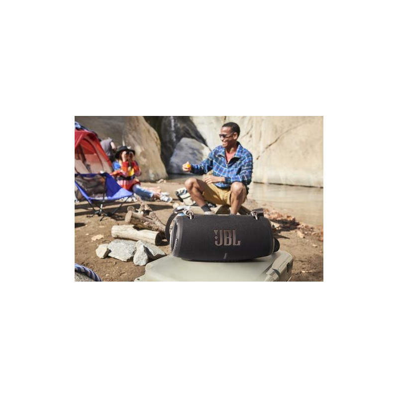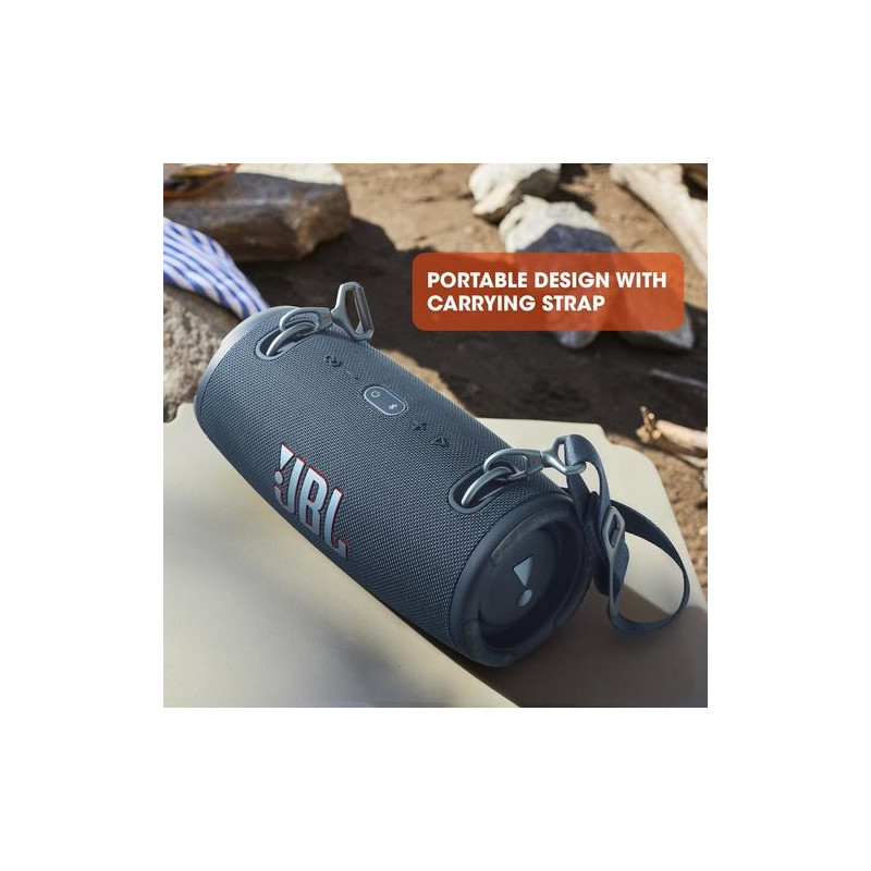 Poolside. Picnics. Just hanging out. Music makes the party.<br>The JBL Xtreme 3 portable Bluetooth speaker effortlessly delivers massive JBL Original Pro Sound. With four drivers and two pumping JBL Bass Radiators, the powerful sound draws everybody in, and with PartyBoost, you can connect multiple JBL PartyBoost-enabled speakers to take things to the next level. <br>A little rain might spoil your fun, but the waterproof and dustproof Xtreme 3 won’t mind at all, and the convenient carrying strap with built-in bottle opener makes it a breeze to move the party indoors. The JBL Xtreme 3 makes a big splash wherever you go.<br><br>Four drivers and two JBL Bass Radiators effortlessly deliver dynamic, immersive sound with deep bass and plenty of detail. You'll get lost in the music wherever you are.<br><br>The fun doesn't have to stop. Packed with an incredible 15 hours of battery life, JBL Xtreme 3 lets you party all day and into the night.<br><br>To the pool. To the park. JBL Xtreme 3 is IP67 waterproof and dustproof, so you can bring your speaker anywhere.<br><br>To the pool. To the park. JBL Xtreme 3 is IP67 waterproof and dustproof, so you can bring your speaker anywhere.JBL Xtreme 3 Blue. Tweeter diameter (imperial): 1.91 cm (0.75"), Tweeter diameter: 2 cm, Woofer diameter (imperial): 6.98 cm (2.75"). RMS rated power: 100 W, Speakers RMS power: 25 W, Frequency range: 53.5 - 20000 Hz. Connectivity technology: Wireless, Bluetooth profiles: A2DP, AVRCP, Bluetooth transmitter modulation: 8DPSK, DQPSK, GFSK. Product colour: Blue, Housing material: Plastic, Volume control: Buttons. Recommended usage: Universal, Mobile operating systems supported: Android, iOS