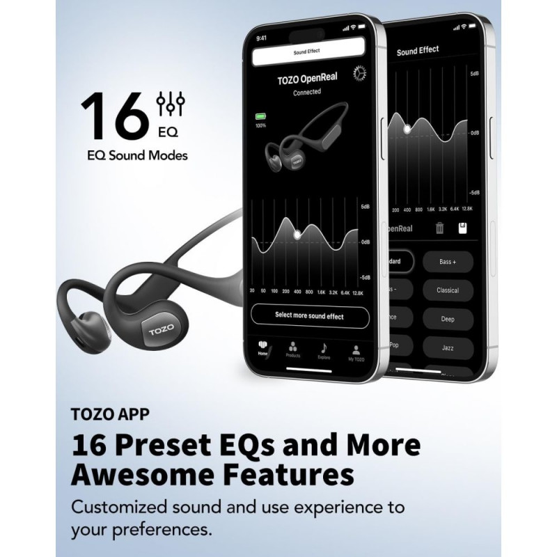 | Using the TOZO App to customize your sound preferences, which allows you to perfectly switch different music styles. Meanwhile, TOZO APP offers quick and easy access to EQ mode switch, which means you can be free to enjoy your favourite listening experiences wherever you are. | |