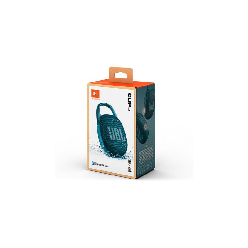 JBL Clip 5. Elementi läbimõõt: 4,5 cm. RMS-võimsus: 7 W, Sagedusvahemik: 90 - 20000 Hz, Signaali-müra suhe (SNR): 85 dB. Ühenduvustehnoloogia: Juhtmevaba, Sagedusvahemik: 2,4 - 2,4835 GHz, Bluetooth-profiilid: A2DP, AVRCP. Toote tüüp: Kaasaskantav monokõlar, Toote värv: Sinine, Kaitsefunktsioon: Veekindel. Soovitatav kasutus: Universaalne