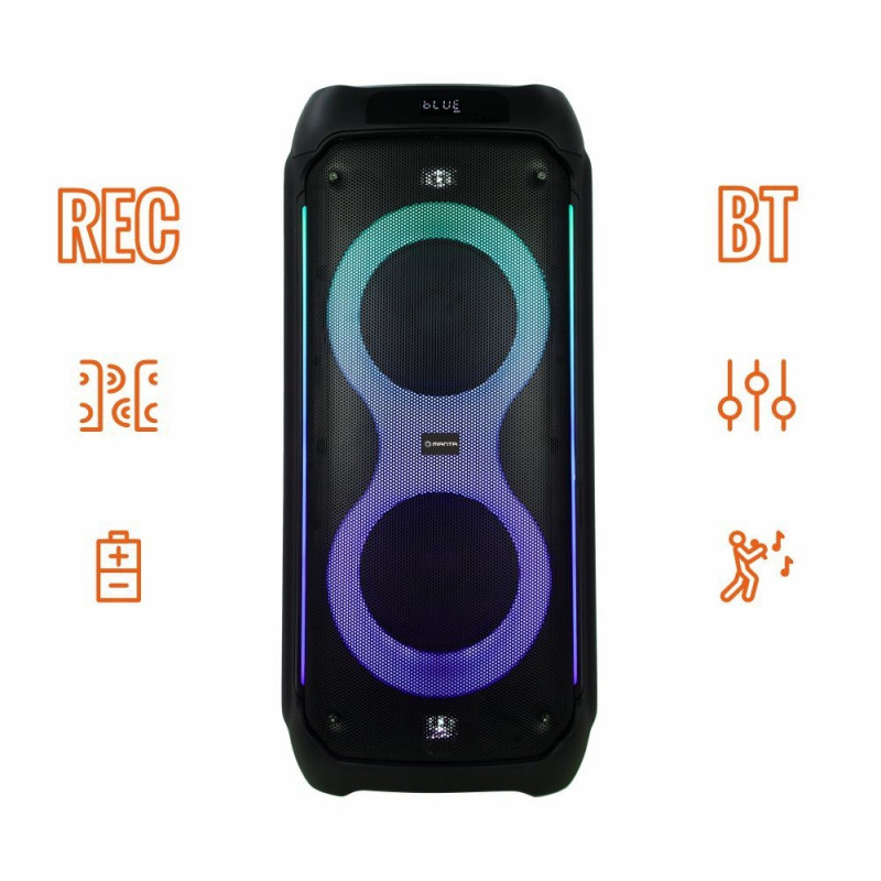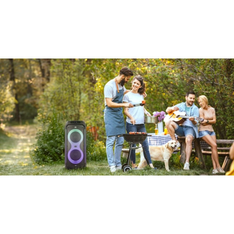 Karaoke funktsioon: Kaasas mikrofon laulmiseks.Värviline LED valgustus: Lisab teie muusikakogemusele visuaalseid efekte.Kaugjuhtimispult: Seadete ja helitugevuse lihtne juhtimine distantsilt.Mitmed ühenduvusvõimalused: Bluetooth, AUX ja USB tugi.Võimas heli: Loodud valju ja selge heli jaoks.Pikk aku tööiga: Ideaalne pikemaks kasutamiseks pidudel või üritustel.