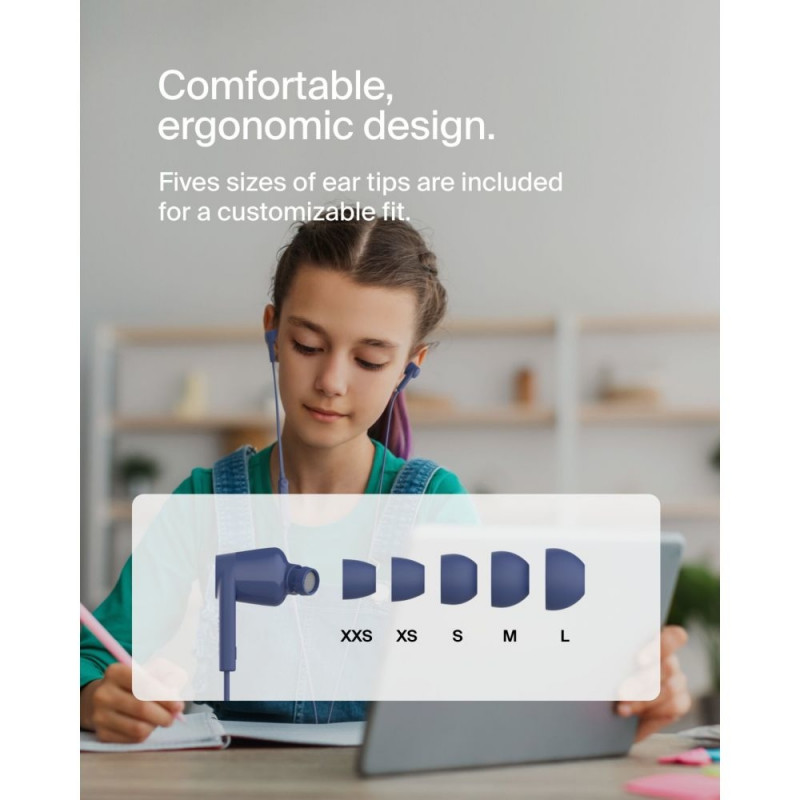 Meie juhtmega USB-C kõrvaklapid on varustatud sassi minemiskindla lameda kaabliga ja sobivad ideaalselt kõrva. Need pakuvad esmaklassilist heli Belkini Signature Soundiga ja on alati kasutusvalmis, kuna patareisid pole vaja laadida. Kuulmiskaitseks mõeldud helitugevuse piirang on 85 dB, kuid vajadusel saab seda suurendada kuni 100 dB. Need kompaktsed kõrvaklapid on vastupidavad, pritsmekindlad, mugavate kõrvaotsikutega viies suuruses ning tagavad suurepärase, häirevaba heliedastuse.
