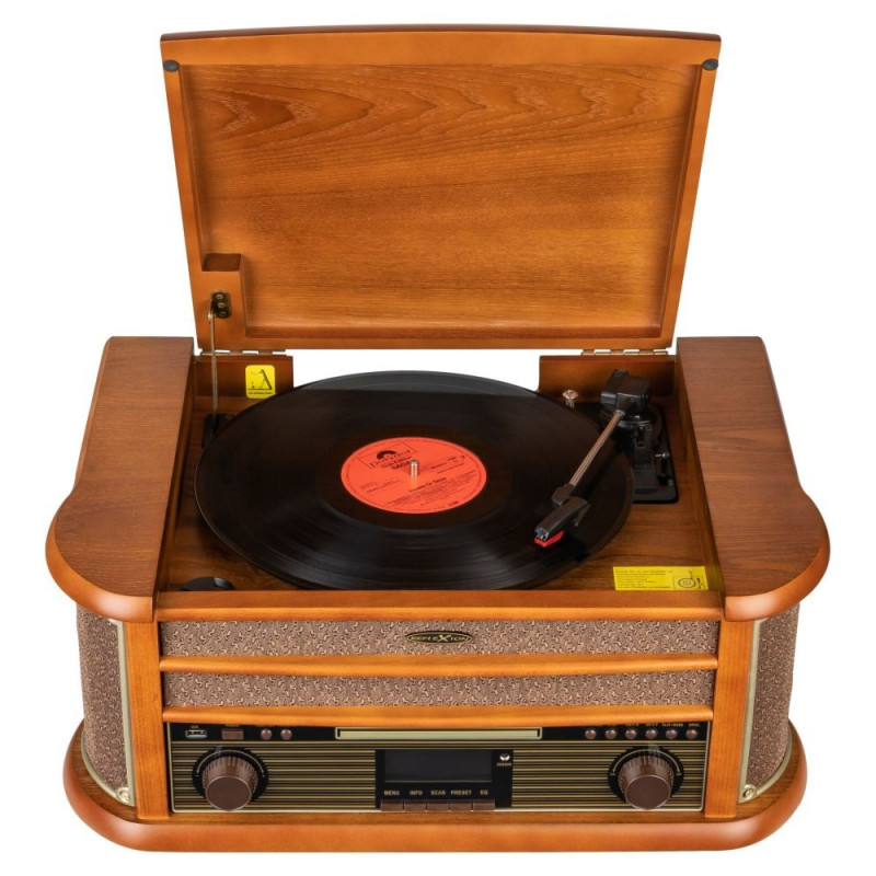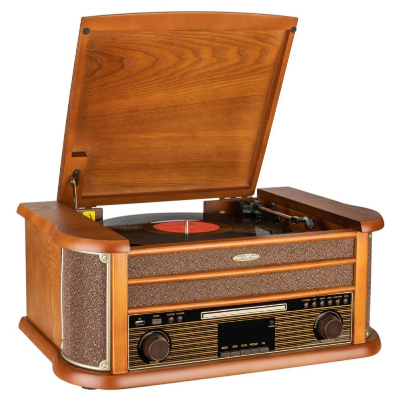 Retrodisain puidust korpuse ja nähtava vinüülimängijaga muudab süsteemi tõeliseks pilgupüüdjaks. Samal ajal saad nautida digitehnoloogia eeliseid, nagu DAB+ vastuvõtt, automaatne jaamade otsing ning mälupesad lemmikjaamadele. Kellaaeg ja kuupäev seadistatakse automaatselt DAB või FM kaudu – või vajadusel käsitsi.