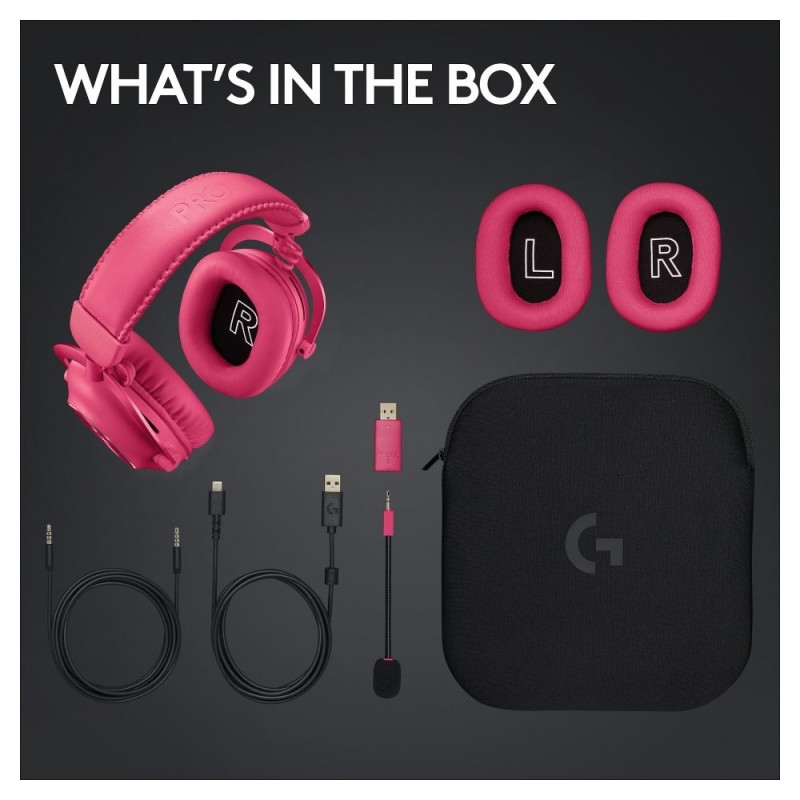 Logitech G PRO X 2 LIGHTSPEED peakomplekt. Tootetüüp: Kõrvaklapid. Ülekandetehnoloogia: Juhtmevaba, Bluetooth. Soovitatav kasutus: Mängimine. Kõrvaklappide sagedusvahemik: 20–20 000 Hz. Juhtmevaba tööraadius: 30 m. Kaabli pikkus: 1,8 m. Kaal: 345 g. Toote värvus: Roosa