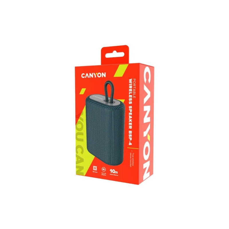 Canyon BSP-4. Kõlaritüüp: 1-ribaline, draiveri läbimõõt: 5,2 cm. RMS-võimsus: 5 W, impedants: 4 Ohm, signaali-müra suhe (SNR): 75 dB. Ülekandetehnoloogia: juhtmevaba, Bluetoothi ulatus: 10 m, USB-pistik: USB Type-C. Tootetüüp: kaasaskantav stereo-kõlar, toote värvus: grafiit, tootedisain: muu. Soovitatav kasutus: mobiiltelefon / nutitelefon, toetatud audioformaadid: MP3, ühilduvad mälukaardid: MicroSD (TransFlash).