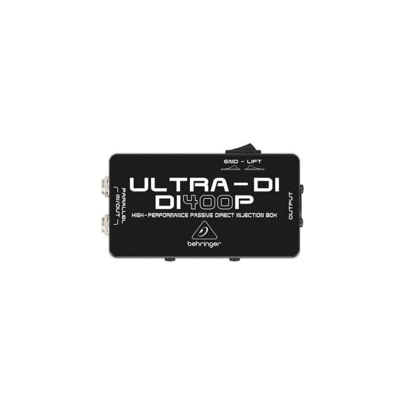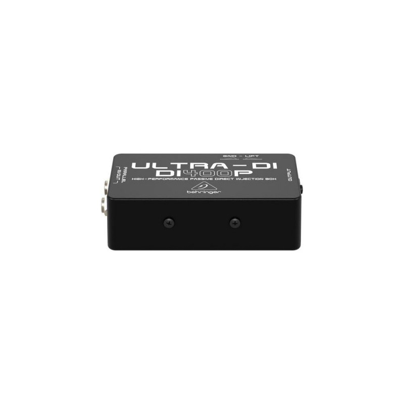- Professional and multi-purpose direct injection box for stage and studio applications.<br>- Provides impedance and signal matching for the direct connection of instruments to mixers and amplifiers.<br>- Ultra-flat frequency response due to renowned BEHRINGER OT-2 transformer.<br>- Allows direct connection to speaker outputs with up to 3,000 Watts.<br>- Ground Lift switch eliminates typical ground loop problems.<br>- Thru/Out jack lets you send the unbalanced signal to an onstage amplifier while the balanced signal is routed to the mixer.<br>- 1/4" TRS and gold-plated XLR connectors.<br>- Ultra-rugged, road-suitable metal case.<br>- High-quality components and exceptionally rugged construction ensure long life and durability.<br>- Conceived and designed by BEHRINGER Germany.<br><br>The ULTRA-DI DI400P is a passive DI (Direct Injection) box for connecting a guitar, bass or keyboard directly to your mixer. With the DI400P as your go-between, impedance-matching problems become a thing of the past, and long cable runs will not sacrifice all of your precious tone.<br><br><b>Directly to the Point</b><br>With its parallel 1/4" In and Out jacks, the DI400P allows you to plug in your instrument and send the same signal to your onstage amplifier, while the XLR Output sends a balanced signal to your mixer. A ground lift switch eliminates hum associated with ground loops and our high-performance transformer provides the ultimate in signal integrity.<br><br><b>Truly Transformative</b><br>The secret to the DI400P’s ruler-flat frequency response is its BEHRINGER OT-2 balanced-line transformer. Praised by audio engineers the world over, the OT-2 provides superior signal isolation from local AC and RF hum, and the ultimate in impedance matching. The resulting output signal is entirely true to the original source – in all its pristine glory.<br><br><b>Great Sound, Exceptional Value</b><br>The ULTRA-DI DI400P is ultra-compact and housed in a tough, road-ready metal case. This means the DI400P DI box will give you great sound gig after gig, session after session. And thanks to its low price, you can afford to outfit the entire band. See for yourself what the incredible ULTRA-DI DI400P can do for your sound at your nearest BEHRINGER dealer – or place your order online today!<br><br><b>You Are Covered</b><br>We always strive to provide the best possible Customer Experience. Our products are made in our own MUSIC Group factory using state-of-the-art automation, enhanced production workflows and quality assurance labs with the most sophisticated test equipment available in the world.Behringer DI400P. Width: 120 mm, Depth: 35 mm, Height: 66 mm