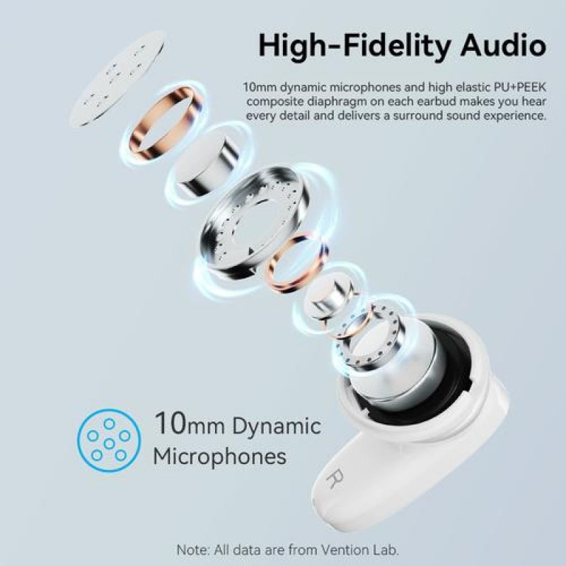 <b>Comfortable Listening</b><br>HiFun True Wireless Bluetooth Earbuds.<br><br><b>Strong & Reliable Signal Via Bluetooth 5.3</b><br>Equipped with the latest Bluetooth 5.3 chip, it has faster transmission, lower power consumption, stronger anti-interference ability and more stable connection than Bluetooth 5.0.<br><br><b>Surrounds You in Sound</b><br>An exclusive acoustic architecture brings your videos, music, and games to life.<br><br><b>Absolute Clarity</b><br>These compact and ergonomic earbuds come with optional silicon fins in a range of sizes to ensure a great personal fit and people only hear you and not your surroundings.<br><br><b>High-Fidelity Audio</b><br>10mm dynamic microphones and high elastic PU+PEEK composite diaphragm on each earbud makes you hear every detail and delivers a surround sound experience.<br><br><b>Long Battery Life</b><br>You have 7 hours of battery life and 21 hours of overall play time, when using the 230mAh charging case to charge on the go.<br><br><b>Fast Fuel</b><br>A quick 15-minute charge with the USB-C cable will provide 1.5 hours music playtime.<br><br><b>Simple Pairing</b><br>After the pairing is successful, the instant you open the case lid, the earbuds begin pairing with your device.<br><br><b>Earbud Work Alone</b><br>You can use either earbud independently.<br><br><b>IPX4-rated, Sweat & Weather Resistant</b><br>IPX4-rated earbuds can withstand splashes, workouts, and rainy days and keep pace with your life under any circumstance.<br><br><b>In-Ear Design, Perfect Fit</b><br>The compact and ergonomic earbuds to ensure a great personal fit and exceptional wearing comfort. Three sizes of eartips are included to help you find your ideal fit.<br><br><b>Voice Control</b><br>iPhone users can press the multi-function button for 2 seconds (left or right) to activate Siri.<br><br><b>Touch Controls</b><br>The wireless earbuds feature an intuitive multi-function button accessed by the simple press of a finger. Open Music app, voice pickup, and more — all at your fingertips.Vention Elf Earbuds E01 White. Product type: Headset. Connectivity technology: Wireless, Bluetooth. Recommended usage: Calls/Music/Sport/Everyday. Headphone frequency: 20 - 20000 Hz. Wireless range: 10 m. Product colour: White