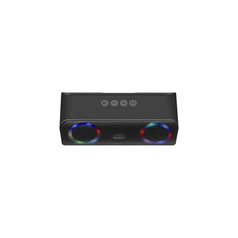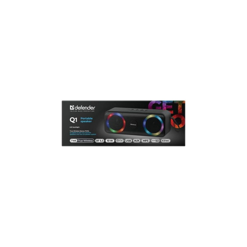 <b>Portable Bluetooth speaker system with LED backlight, built-in MP3 player and FM tuner. Support for flash drives and microSD memory cards.</b>Defender Q1. Audio output channels: 2.0 channels, Speaker type: Full range, Driver diameter: 5.8 cm. RMS rated power: 10 W, Impedance: 3 Ω, Signal-to-Noise Ratio (SNR): 85 dB. Connectivity technology: Wired & Wireless, Frequency range: 100 - 20000 GHz, Bluetooth range: 10 m. Product type: Stereo portable speaker, Product colour: Black, Product design: Rectangle. Recommended usage: Mobile phone / Smartphone, Audio formats supported: MP3, WMA, Compatible memory cards: MicroSD (TransFlash)