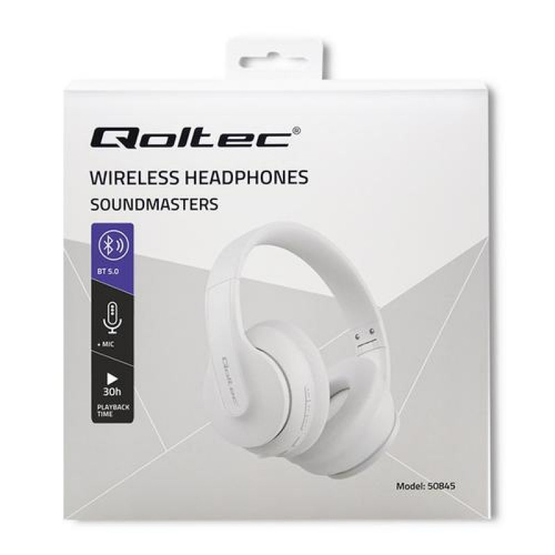 Qoltec wireless headphones are a perfect solution for people who value a combination of functionality, comfort and the highest quality of sound.<br>The control panel located on the handset gives you full control.<br><br><b>EXPERIENCE THE SOUND WITHOUT DISTRACTIONS</b><br>If you value the combination of functionality, elegant design, comfort in use and the highest quality sound without interference and noise - our product meets you.<br>Bluetooth 5.0 technology allows you to use the headphones wirelessly, and the range of up to 10 meters provides freedom of movement. Thanks to the lightweight design, the headphones do not become a burden and you can enjoy your favourite music for a long time.<br><br><b>TALK WITHOUT INTERRUPTION</b><br>The headphones have a built-in microphone - so you don't have to interrupt your activities to answer the phone and make a call. In addition, they have a panel with which you can switch music, pause or adjust the volume, and full charging will allow you to enjoy your music for up to 30 hours. Everything is supervised by a control LED, which indicates the start and end of charging.Qoltec 50845. Product type: Headset. Connectivity technology: Wireless, Bluetooth. Recommended usage: Calls/Music. Headphone frequency: 20 - 22000 Hz. Wireless range: 10 m. Weight: 213 g. Product colour: White