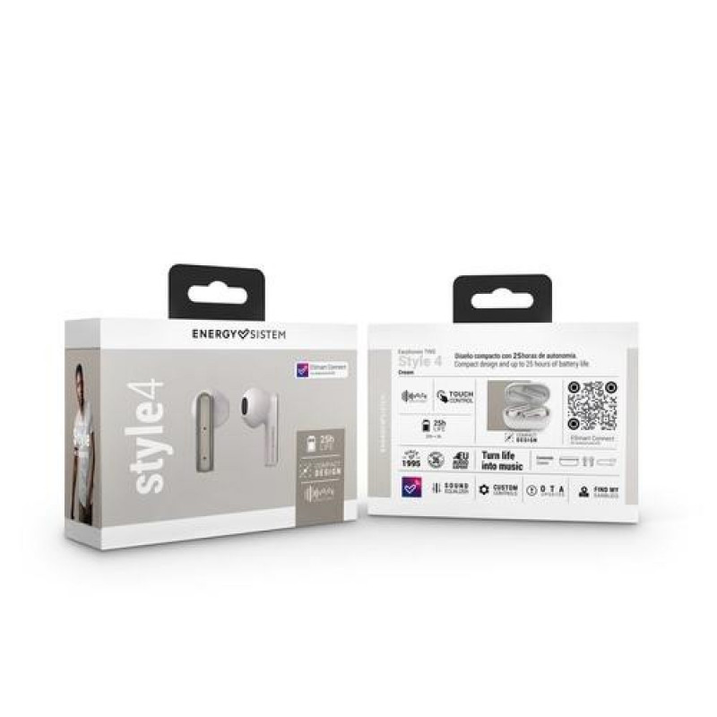 True Wireless earphones to enjoy your music wirelessly. Compact, ergonomic design. Customise your music and controls thanks to ESmart Connect and Voice Assistant. With 25 hours of battery life when topping up with the charging case.<br><br><b>Your music always on</b><br>Wireless earphones with case to charge the battery wherever you go. This way you’ll never miss your music! Up to 25 hours of battery life (5 hours per earphone charge, plus an additional 20 hours in the charging case).<br><br><b>ESmart Connect app</b><br>Customise your earphone settings with the ESmart Connect app. With sound equalisation functions and Find my earbuds (to easily find your earbuds when you mislay them). Configure playback to your liking with Touch Control, and enjoy OTA updates on your device.<br><br><b>Lightweight and compact</b><br>With their ergonomic design, True Wireless Style 4 earphones fit snugly in your ear, so you can listen to your favourite tracks in total comfort. The charging case is so light and compact that you can keep them in your pocket, in your backpack, or at the bottom of your handbag.<br><br><b>Voice assistant and touch control</b><br>Energy Sistem wireless earphones come with Voice Assistant to help you easily find what you are looking for using voice commands. With Touch Control, Bluetooth® 5.1 wireless technology, True Wireless with automatic synchronisation, and hands-free function.Energy Sistem Style 4. Product type: Headset. Connectivity technology: True Wireless Stereo (TWS), Bluetooth. Recommended usage: Calls/Music. Headphone frequency: 20 - 20000 Hz. Wireless range: 20 m. Weight: 42 g. Product colour: Cream