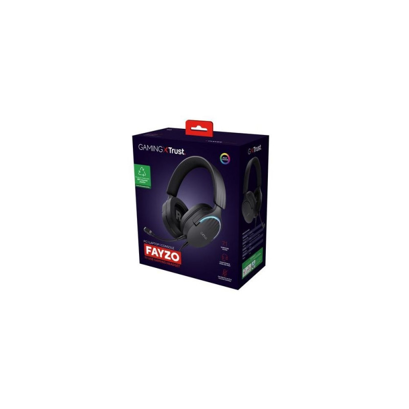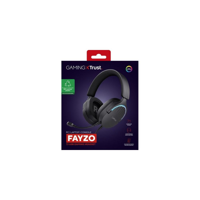 Powerful over-ear 7.1 USB gaming headset for an immersive gaming experience<br><br><b>Surround yourself in the sound</b><br>Prepare to be blown away with the Fayzo. With virtual 7.1 surround sound and 50mm drivers, you’ll hear every word, footstep, bang, ding and more to experience your games like never before.<br><br><b>Play for the planet</b><br>Game in a way that’s good for you and good for the planet. With an eco-friendly design of 85% recycled plastics, the Fayzo helps you play with crystal-clear sound and a clear conscience too!<br><br><b>Irresistibly comfortable</b><br>Perfect for those marathon gaming sessions, this headset has über-comfortable earpads and adjustable swiveling ear-cups that will keep your head feeling happy all day long. Bliss!<br><br><b>Mic on, mic off</b><br>Your teammates need you, so make sure they capture your every word with the Fayzo’s noise-cancelling microphone. Flexible and detachable, it can even be folded away or taken off completely when it’s not needed!<br><br><b>Light it up</b><br>This headset’s got both style and substance. With adjustable multicolour RGB lighting, choose between three vibrant colours modes to add an extra dash of awesome to your gaming setup.<br><b><br>Hear and be heard</b><br>Seamlessly control your sound with the Fayzo’s easy-to-reach volume control and on-ear microphone mute button. That means less time fussing with controls and more time gaming!<br><br><b>Stay connected</b><br>Never let a short cable hold you back. With an extra-long 2m cable, this headset gives you the freedom to move and play without restrictions, no matter how intense it gets.<br><br><b>Do it your way</b><br>Take full control of your listening experience with the Fayzo. The included PC software allows you to create custom EQs, adjust your microphone ENC (environmental noise cancellation), and fine-tune the 7.1 sound – how cool is that?!<br><br><b>Platform partner</b><br>The Fayzo has so many incredible features already, but its compatibility with PC, PS4 and PS5 just makes it even better! Whichever platform you prefer, this is the headset for you.Trust GXT 490 FAYZO over-ear 7.1 USB-gamingheadset.. Product type: Headset. Connectivity technology: Wired. Recommended usage: Gaming. Headphone frequency: 20 - 20000 Hz. Cable length: 2 m. Weight: 290 g. Product colour: Black