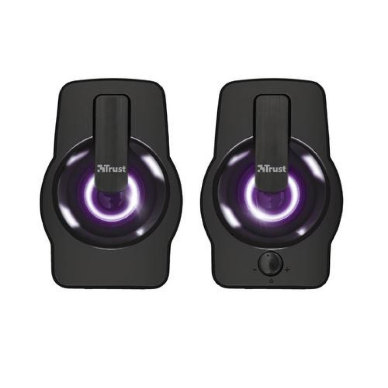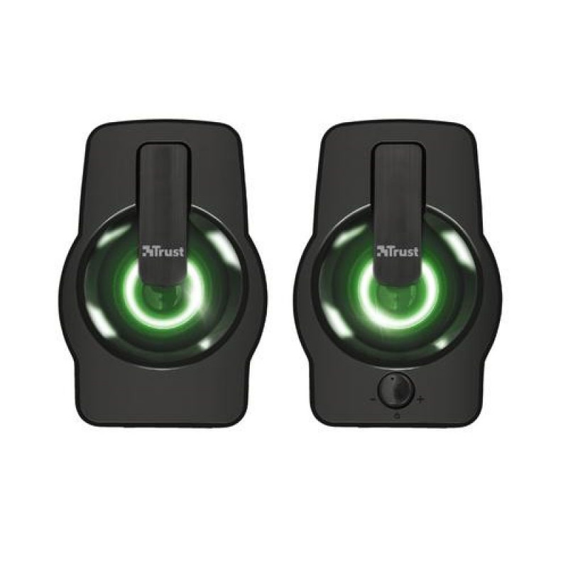 Compact speaker set with stylish design and RGB LED illumination<br><br><b>RGB LED illuminated 2.0 speaker set</b><br>The Gemi RGB LED Illuminated 2.0 speaker set is a stylish and compact speaker set to complete your home or office set-up. With the 12W peak power (6W RMS), you can enjoy movies, gaming sounds and your favourite music coming from your PC or laptop. It ensures clear sound while taking up minimal desk space.<br><br><b>Easy installation</b><br>The Gemi works with every PC or laptop and is USB-powered which means that you can install the speakers very easily. Simply plug in the 140cm USB cable and 3.5mm audio connection cable and it is ready to use: no wall power needed. Once plugged in, the speaker will light up with an automated RGB colour cycle. You can turn the speakers on or off and adjust the volume with the button placed on the front. It is the colourful addition to any desk!Trust Gemi. Recommended usage: Speaker set unit. Audio output channels: 2.0 channels, Number of drivers: 2. Connectivity technology: Wired. RMS rated power: 6 W, Frequency range: 20 - 20000 Hz. Product colour: Black