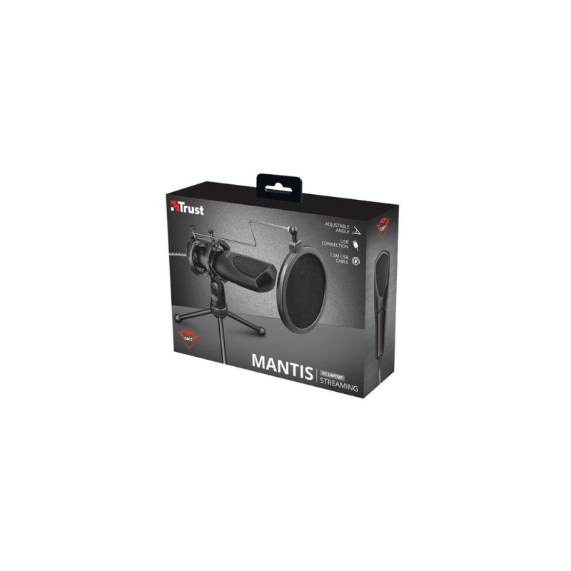 USB microphone with tripod for streaming, podcasts, vlogs and voice-overs<br><br><b>High-level talk</b><br>The Mantis has a USB adapter for high-quality, distortion-free digital audio. Apart from talking to your teammates, this microphone is made for perfect use with Twitch, YouTube or the platform of your choice: everyone will hear you clearly.<br><br><b>Stand-up</b><br>The Mantis is equipped with a tripod stand and makes it possible to adjust the angle of the microphone. This allows you to use the microphone easily in the most comfortable way possible. The universal shock mount and pop filter make sure you are set for clear audio reproduction.<br><br><b>Success is in your hands</b><br>Thanks to the 1.5m cable, you can place the Mantis anywhere. Don’t want to be stuck behind your desk? The Mantis can also be used without the tripod, by simply holding the microphone in your hand. Sing, dance or vlog your way to the top!Trust GXT 232 Mantis. Type: PC microphone, Microphone sensitivity: -38 dB, Microphone frequency: 50 - 16000 Hz. Connectivity technology: Wired, Device interface: USB. Product colour: Black, Cable length: 1.5 m, Compatible operating systems: Chrome OS. Power source: USB. Width: 50 mm, Depth: 35 mm, Height: 150 mm