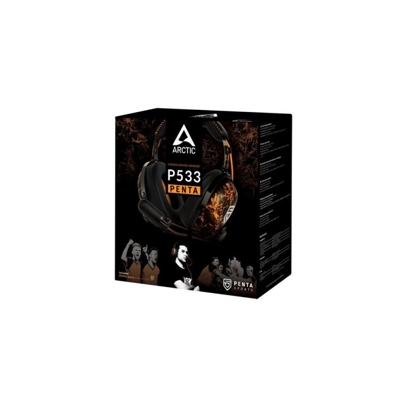 <b>Designed by Pro-Gamers to Perfect Your Gaming</b><br>Ambitious gamers are daily confronted with the toughest challenges. With the P533 PENTA, you get the perfect equipment. We have further developed our gaming headset with the leading German eSport brand PENTA Sports to guarantee the best gaming experience.<br><br><b>Articulated Boom Microphone</b><br>Want to talk while gaming or just calling a friend? The integrated boom microphone ensures that your counterpart understands you clearly. If you don't want to be heard, just turn up the mic and it is automatically mute.<br><br><b>Strong Bass and<br>Crisp Treble</b><br>Sturdy sound with powerful bass and crisp <br>highs via 40 mm neodymium drivers.<br><br><b>Integrated Volume Control</b><br>Easy and quickly handling to adjust the sound volume with convenient volume wheel.<br><br><b>High Comfort for <br>Non-Stop Gaming Action</b><br>Optimal fitting through smooth, excellent sound sealing <br>earpads and soft leatherette headband.<br><br><b>Enough Free Space for Unrestricted Gaming</b><br>The 1.2 m cable with TRRS connector enables compatibility with PC, Mac, Laptop, Tablet, <br>Smartphone, Xbox, Playstation and other devices with 3.5 mm jack. Enough free moving <br>space through 2 m extension cable with 2 x 3.5 mm jack.<br><br><b>Stable Carrying Case</b><br>So that your headphones reach your next LAN party without damage, your P533 comes in a stable travelling case.ARCTIC P533 PENTA - Stereo Gaming Headset. Product type: Headset. Connectivity technology: Wired. Recommended usage: Gaming. Headphone frequency: 20 - 20000 Hz. Cable length: 2 m, Product colour: Black, Orange