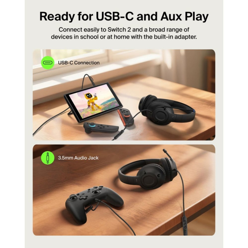 Kaitse laste kõrvu nende spetsiaalselt ohutuse ja mugavuse jaoks loodud juhtmega, kõrvapealsete kõrvaklappidega. Ühildub Nintendo Switch 2-ga ning omab 85 dB helitugevuse piirangut, mis võimaldab muretut mängimist kodus, koolis ja mujal.