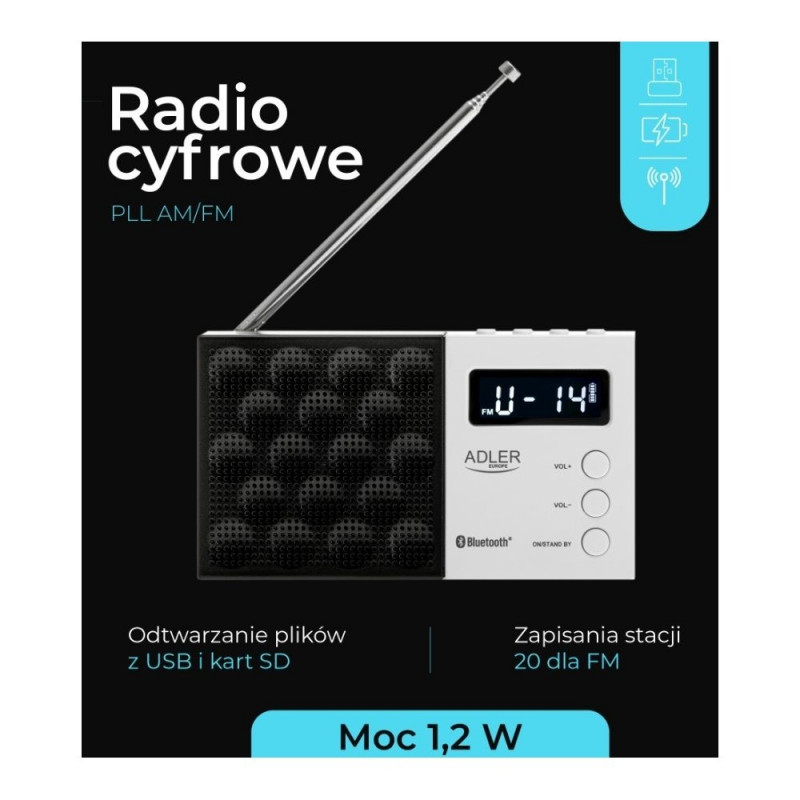Adler AD 1908 on kaasaegne PLL AM/FM digitaalraadio, mis ühendab klassikalise raadiofunktsionaalsuse täiustatud võimalustega, nagu Bluetooth 5.0 ning taasesitus USB/SD andmekandjatelt. Lai FM-sagedusvahemik, lemmikjaamade salvestamise võimalus ja multifunktsionaalne LCD-ekraan tagavad mugava kasutuse ja kõrgekvaliteedilise heli.
