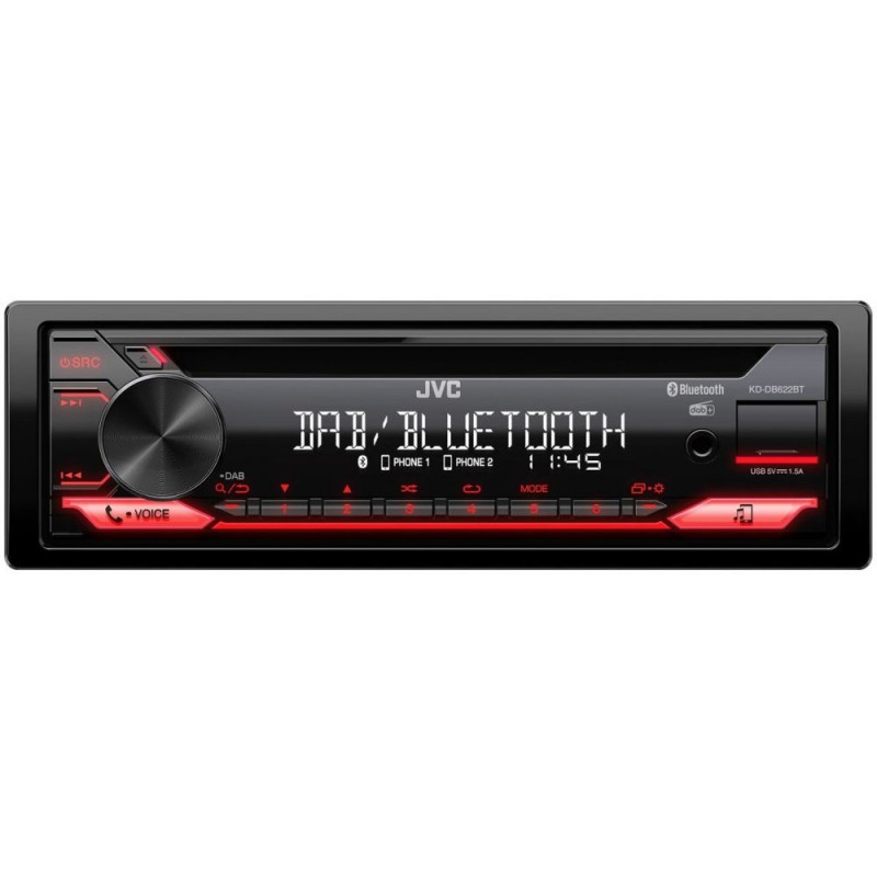 JVC KD-DB622BT. Toote värv: must, DIN-suurus: 1 DIN, väljundvõimsus: 200 W. Ekraani tüüp: LCD, valgustuse värvid: valge, menüükeeled: hispaania, prantsuse, vene. Bluetooth-profiilid: A2DP, AVRCP, Bluetooth-funktsioonid: heliedastus, käed-vabad kõned, USB-pistik: USB tüüp A. Toetatud sagedusalad: AM, DAB+, FM, digitaalne FM-raadio: 87,5–108,0 MHz, AM-sagedusala: 531–1 611 kHz. Laius: 182 mm, sügavus: 156 mm, kõrgus: 53 mm.