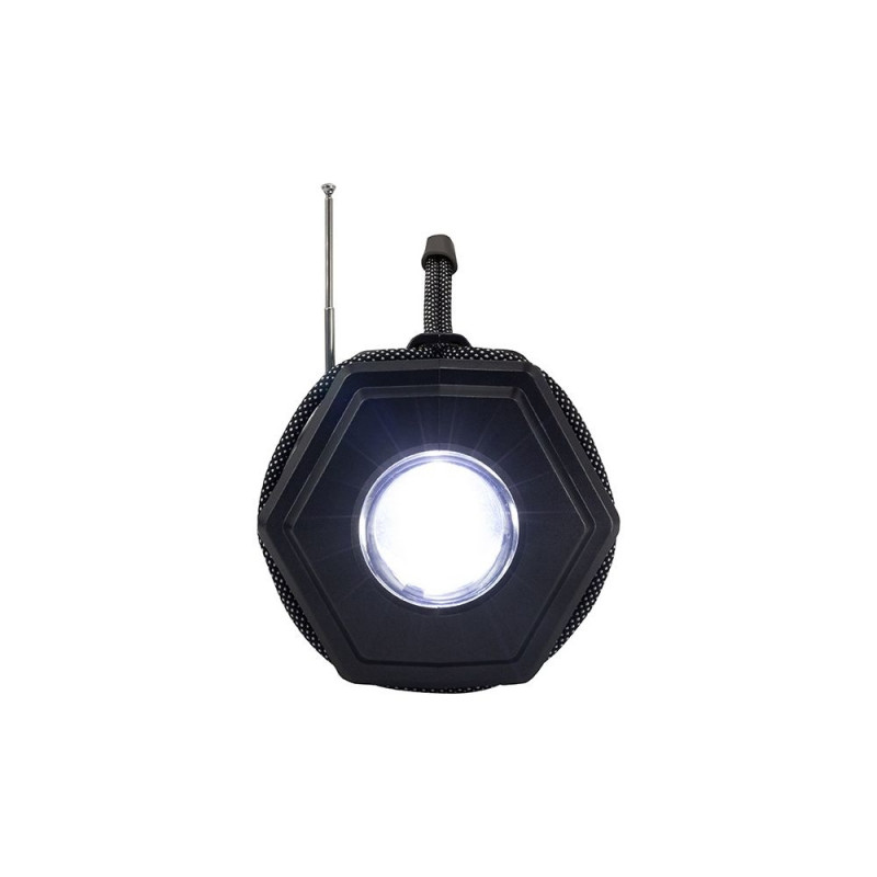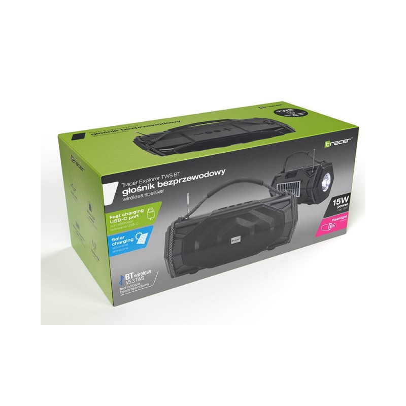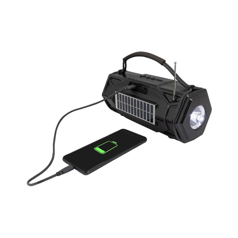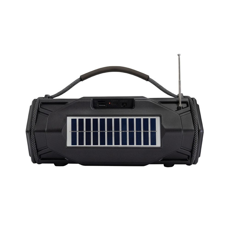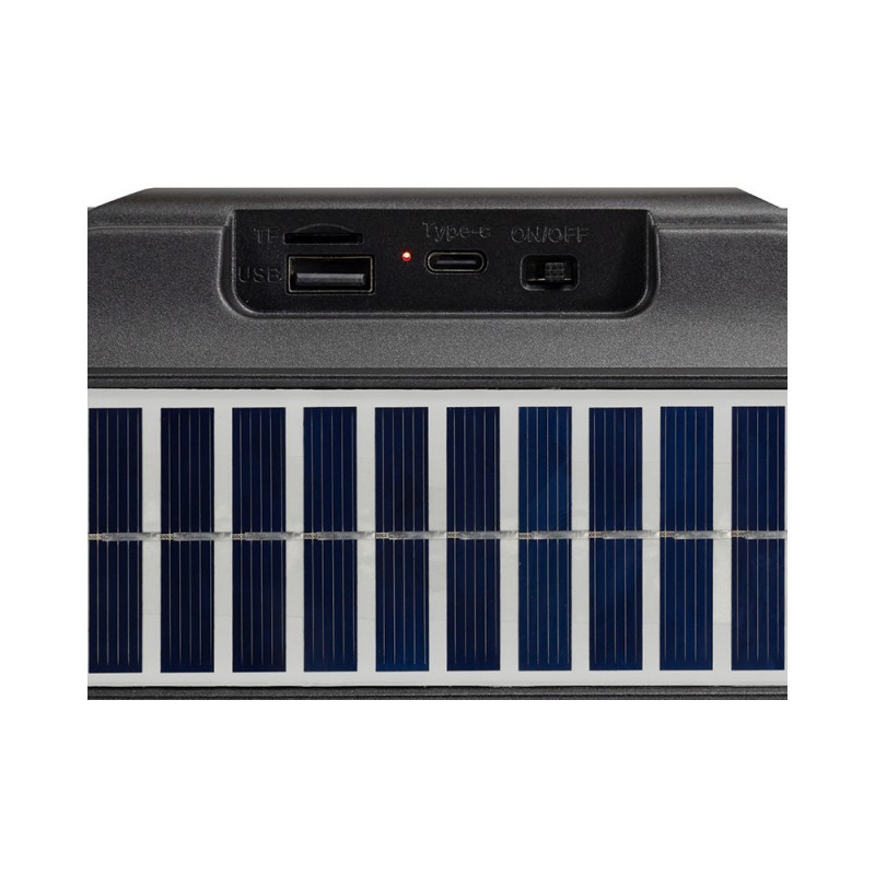 TWS-tehnoloogia Bluetooth 5.3 15 W RMS-väljundvõimsus Sisseehitatud taskulamp Päikesepaneel - päikeseenergial laadimine 1800 mAh aku - kuni 5 tundi tööaega - varupatarei funktsioon FM-raadio Muusika taasesitus mälukaardilt ja USB-lt