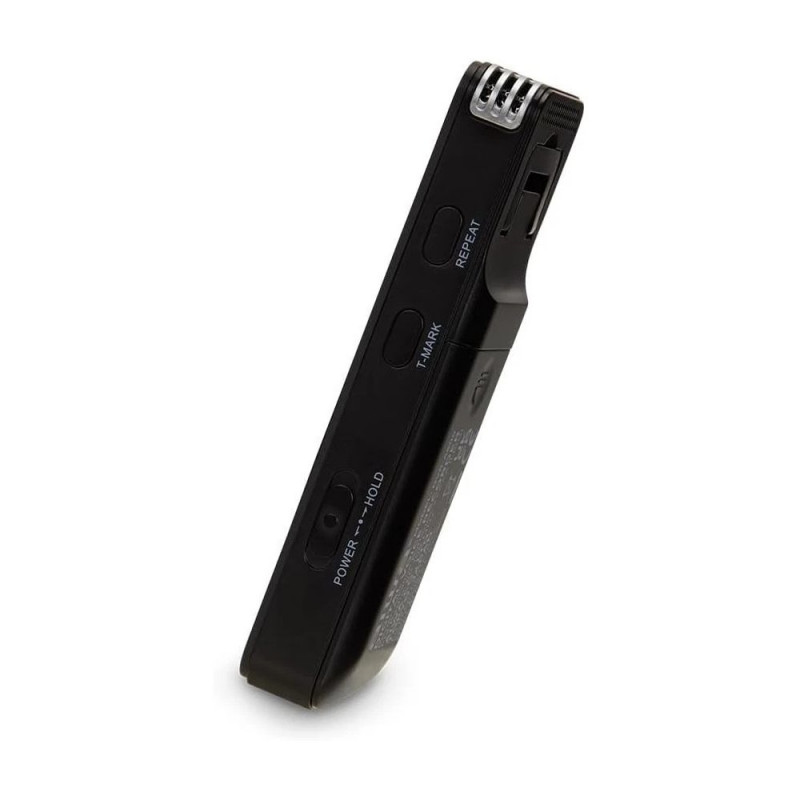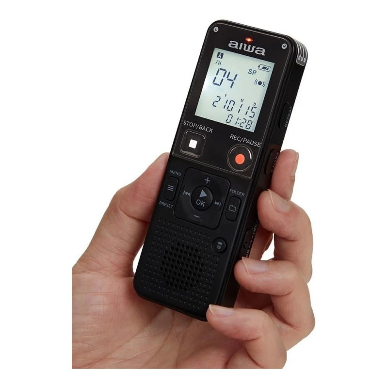 The Aiwa DVR-A600 is a compact digital voice recorder designed for lectures, interviews, and meetings. It features 16 GB of internal storage and supports microSD cards up to 128 GB. Two stereo microphones capture clear audio, while the voice-activated recording (VOR) function starts automatically when sound is detected. Supports MP3 and WAV formats, and the USB-C interface allows easy file transfer to a computer.