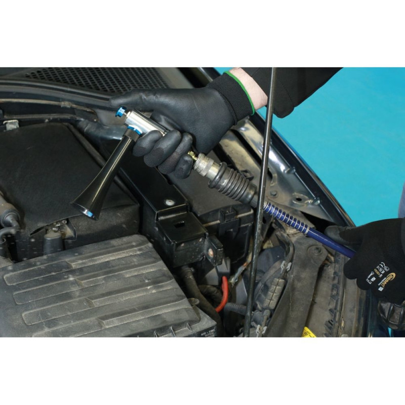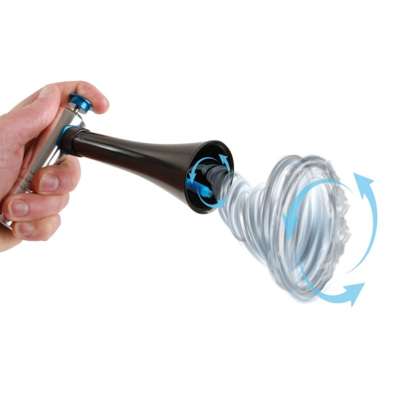 Alumiiniumist korpusega püstol, millel on tornaadootsik, mis loob tolmu ja prahi eemaldamiseks keeriselaadse õhulehtri.