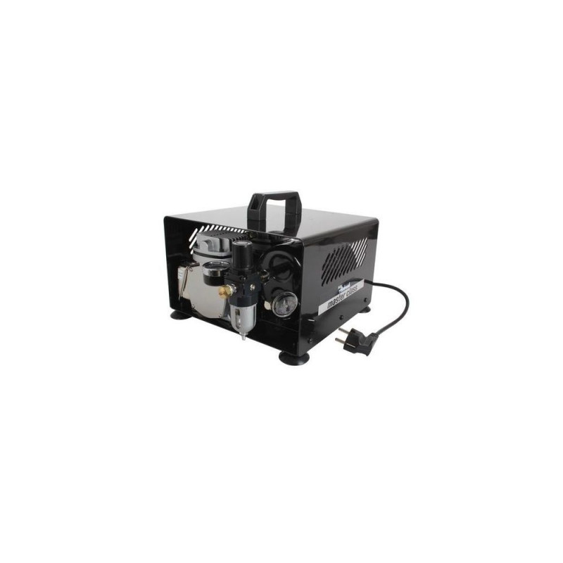 The 'master class' compressor is an oil-free double cylinder piston compressor. It works best with our 'master class' spray-guns. It is ideal for airbrush pros and all airbrushing work.<br><br>- Type: Oil-free piston compressor (220 - 240 V / 50 Hz / 145 W)<br>- Maximum pressure: approx. 4.4 bar<br>- Output in litres of air: approx. 32 l/min<br>- Air tank: approx. 2.5 l<br>- Noise level: approx. 50 db<br>- Extras: Double cylinder, 2 manometers, pressure regulator, water separator, air tank with condensation drain valve, safety valve, automatic switch-off system, carrying handle.<br>- Connectors: Fitted as standard with the connector (1/4 inch) for hoses 38230 (with compressor adapter) and 38250. The compressor adapter is included, but the hoses are not included in the set.Revell 39138. Intake capacity: 32 l/min, Maximum operating pressure: 4.4 bar, Noise level: 50 dB. Product colour: Black. Motor power: 145 W, Power source: AC, AC input voltage: 220-240 V