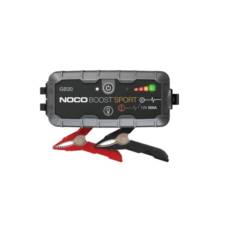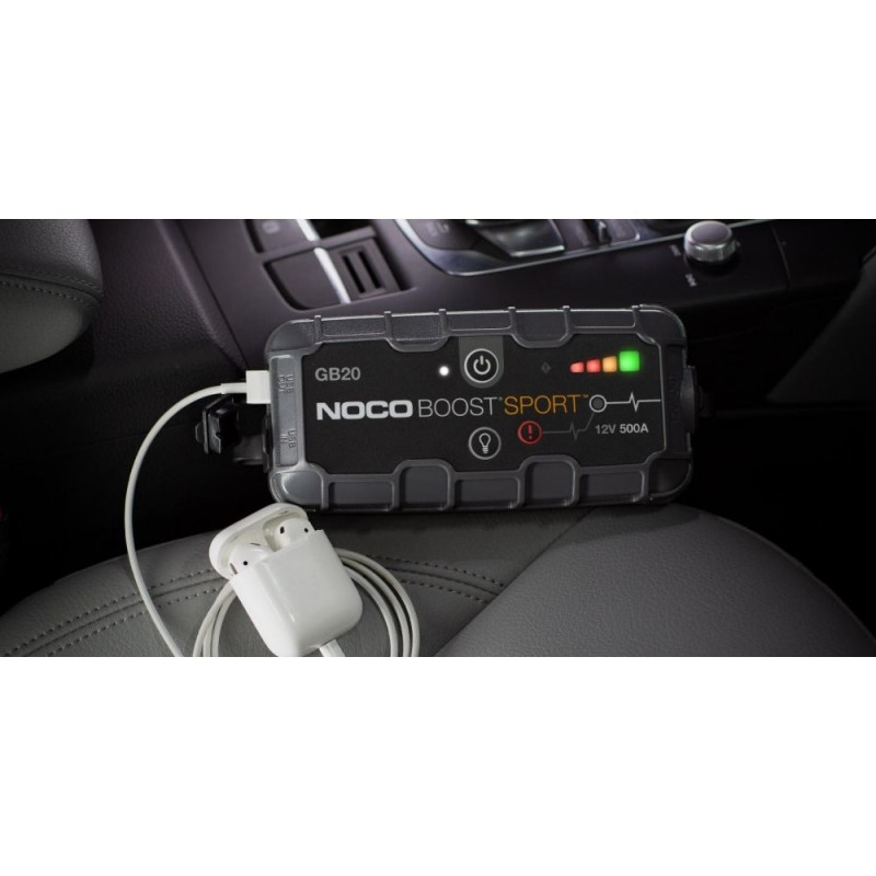 NOCO GB20 sõiduki käivitusabi sisaldab liitiumioonaku tehnoloogiat, sisseehitatud ekraani ja suure võimsusega väljundvoolu 500 A. Samuti on sellel mikro-USB port ja USB port mitmekülgseks ühendamiseks.