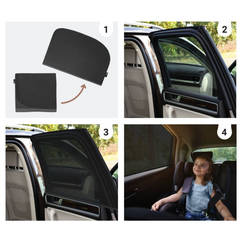 SIPO practical set of two mesh sunshades designed to darken rear side car windows. Created with the comfort of children traveling in the back seat in mind, the product is made from lightweight yet durable polyester material. It effectively blocks sunlight by covering the entire window surface, reducing interior heat buildup and enhancing thermal comfort on hot days. The mesh not only shields from sunlight but also increases in-car privacy, which is particularly useful during activities like breastfeeding.
