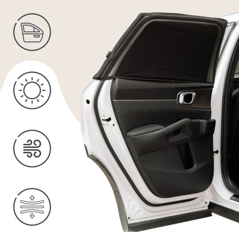 The greatest design advantage of the shade is that it allows the window to be freely opened and closed without removing the fabric. The universal XL size fits most vehicles – from standard passenger cars to SUVs and station wagons. No glue or suction cups are required – simply stretch the shade over the door frame for quick, damage-free installation and removal.