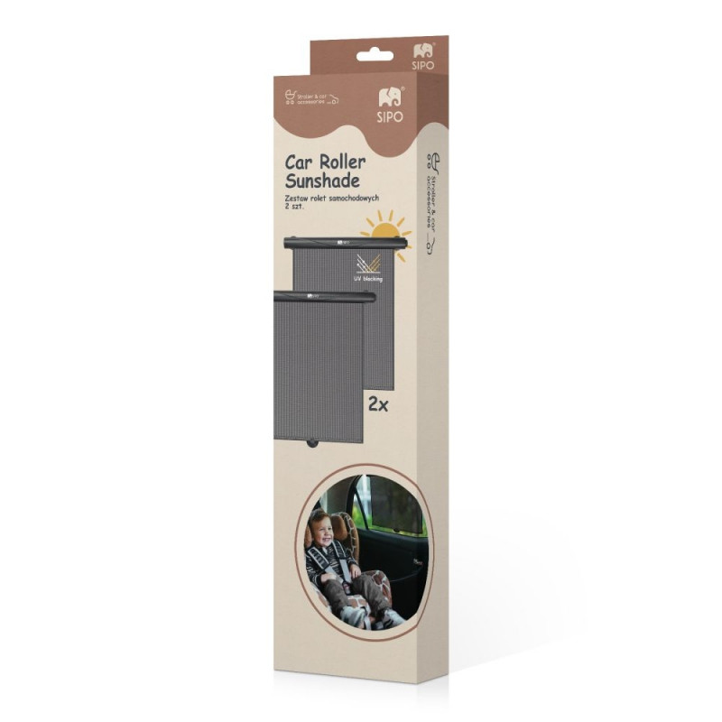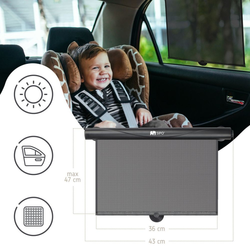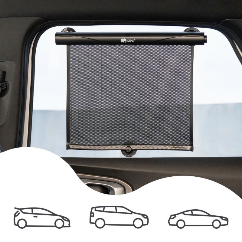 SIPO functional retractable car roller sunshade designed for the safety and comfort of young passengers. Its lightweight yet durable ABS construction effectively filters sunlight while maintaining clear outward visibility through the mesh fabric. This window shade blocks harmful UV rays and helps reduce the interior temperature—especially important during hot summer months. The sunshade features a practical automatic rolling mechanism: simply press the side button and the material retracts effortlessly. Thanks to its adjustable length, the shade does not need to be fully extended—it can be partially rolled and secured to fit the current conditions and passenger needs. Designed with user convenience in mind, the roller shade is easy to install and remove. When folded, it becomes compact enough to fit inside a glove compartment or a car door pocket.