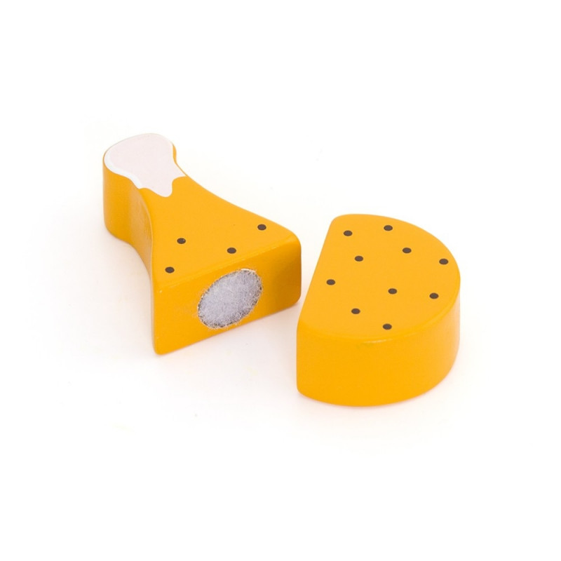 *A wooden food playing set includes various food and a knife, which also comes with a wooden cutting board with a handle for easy transporting.