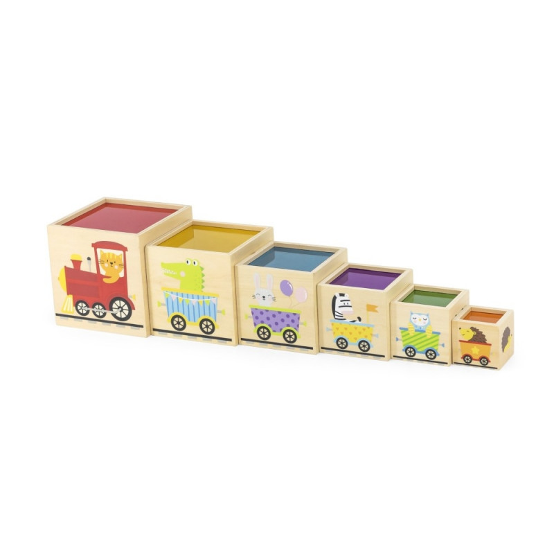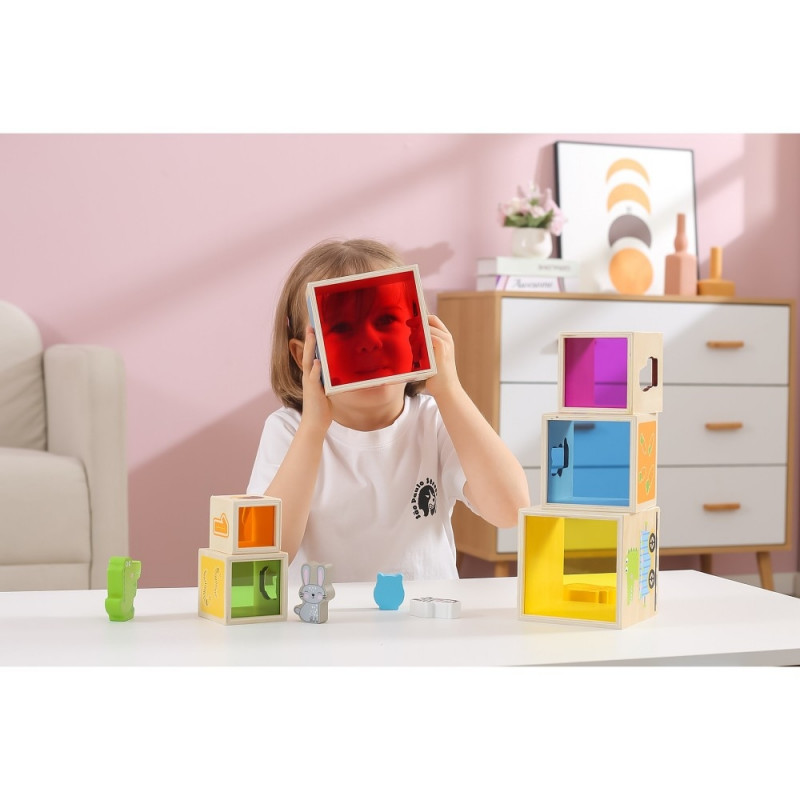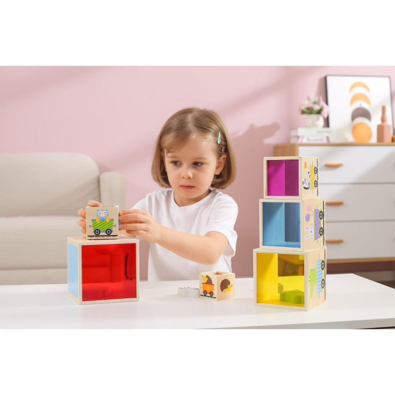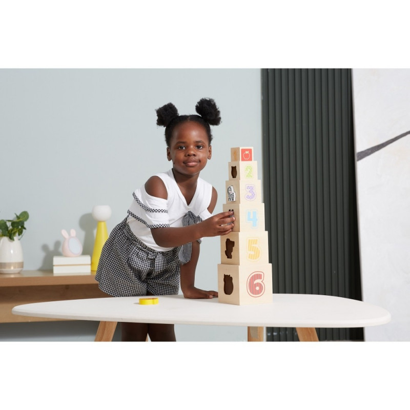 * Children are introduced with numbers, shapes, colors, sizes and animals while playing with nesting and stacking.