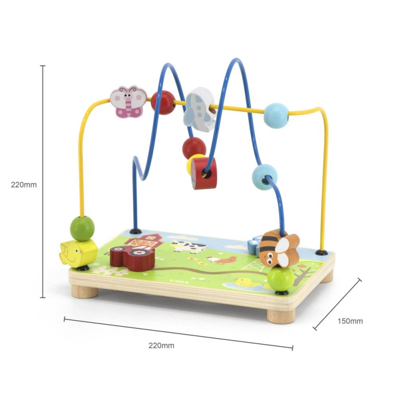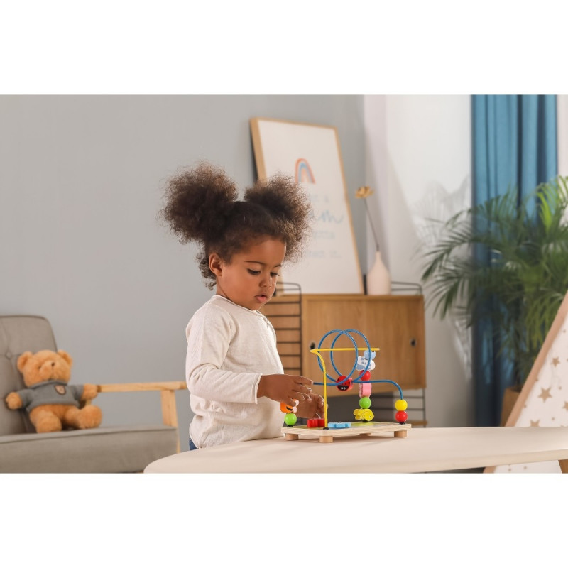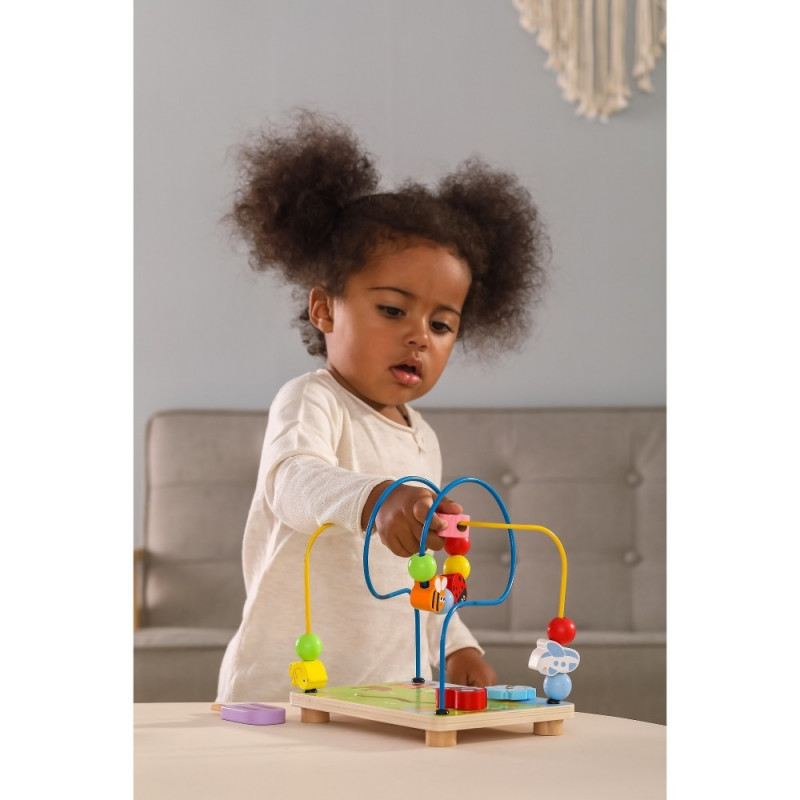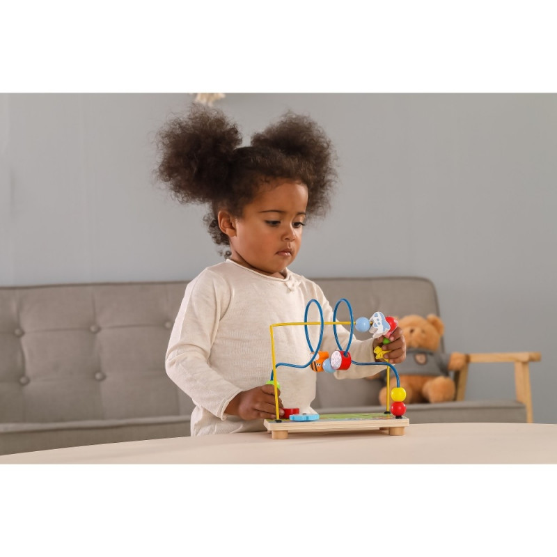 * Move the wooden beads, butterflies, flowers and ladybug pieces around the coloured wire maze for hours of fun.