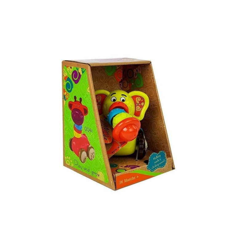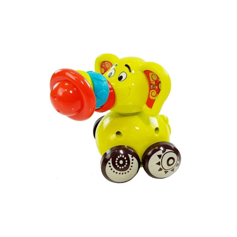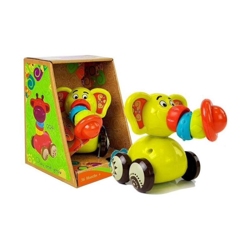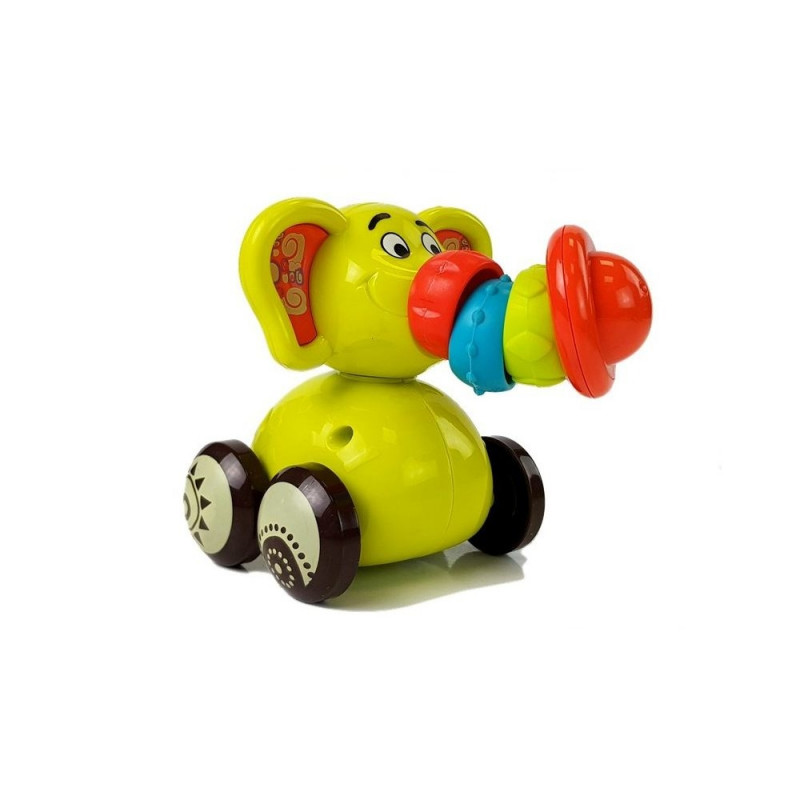 Toode, mis sobib ideaalselt sinu lapse arenguks – lisaks näeb see sõbralik välja ja on kaunites värvitoonides. Eeliseks on veniv kummist lont, millel on erineva struktuuriga ovaalsed kujundid – see aitab lapsel arendada kompimismeelt, õppida uusi kujundeid ning stimuleerib propriotseptsiooni. Londi otsas on ilus punane mütsike. Elevant on neljal rattal nagu väike auto – sellega saab sõita mööda põrandat või mööblit ning taustal kostab kõristi helin.