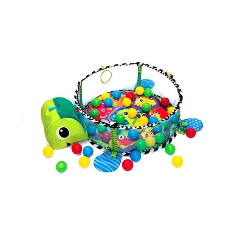 Komplekti kuulub 30 eri värvi palli, mida saab basseini sisse valada, pakkudes lapsele unustamatut mängurõõmu. Hiljem saab kõik pallid kilpkonna pähe peita ning muuta mäng basseini pealt matiks. Komplektis on ka 4 erinevat mereteemalist mänguasja, mida saab riputada kaartele. Need köidavad lapse tähelepanu ning ta soovib avastada nende struktuuri ja välimust.